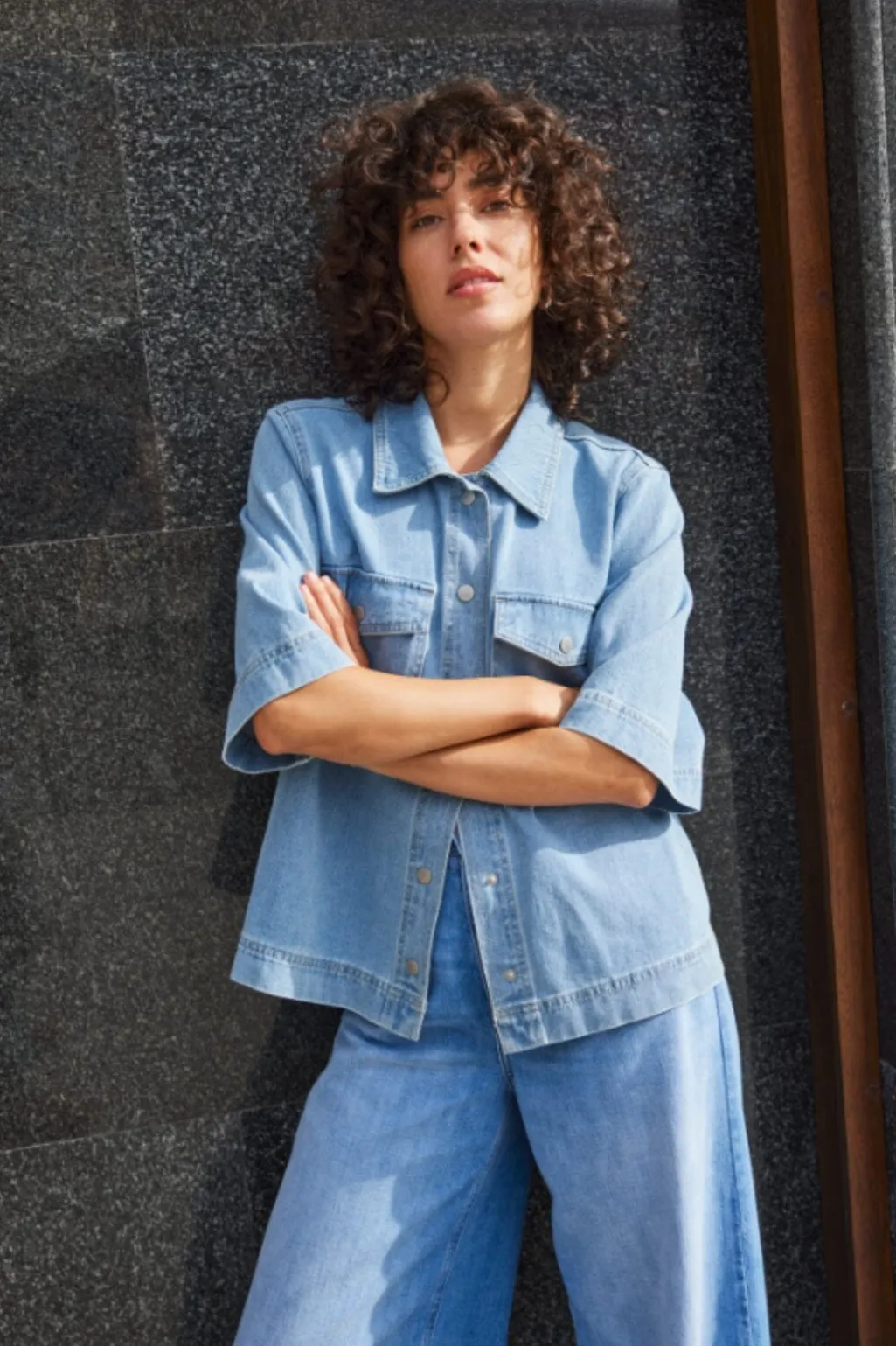 Lyseblå denimskjorte fra Only med korte ærmer og brystlommer. Skjorten har en klassisk skjortekrave og knaplukning hele vejen ned foran.