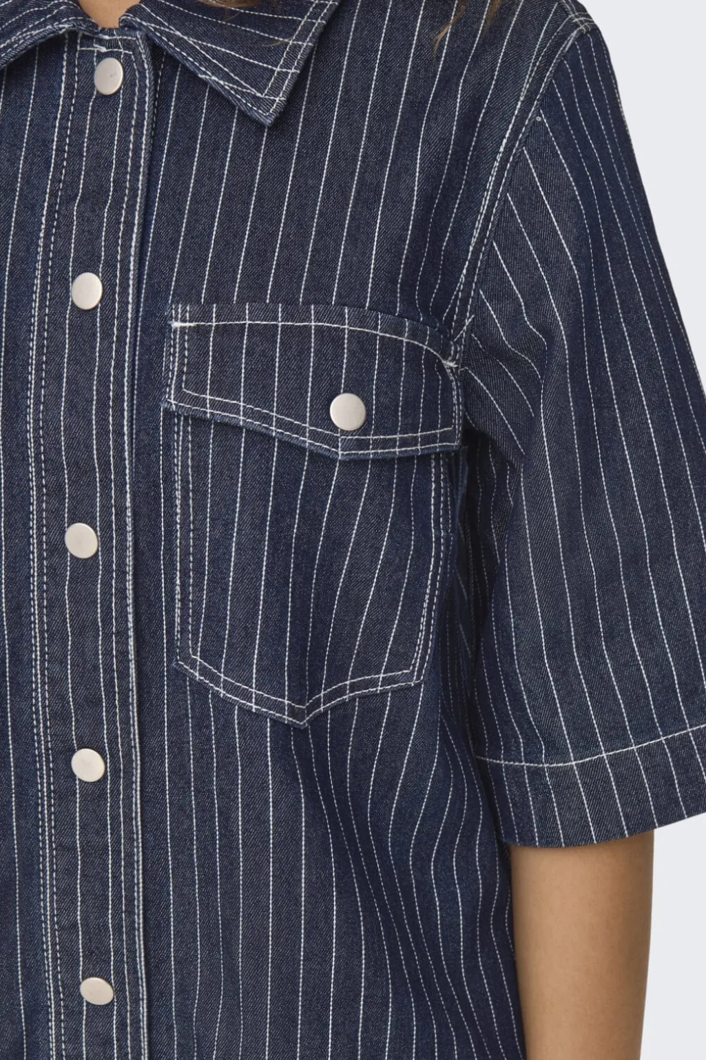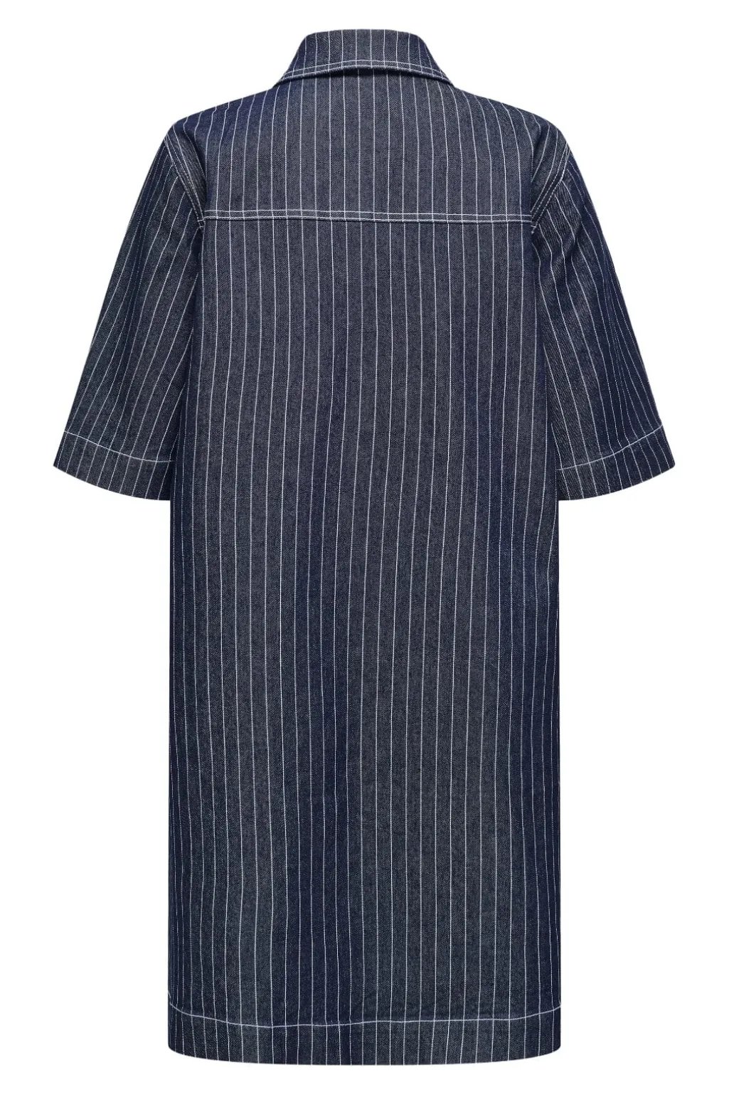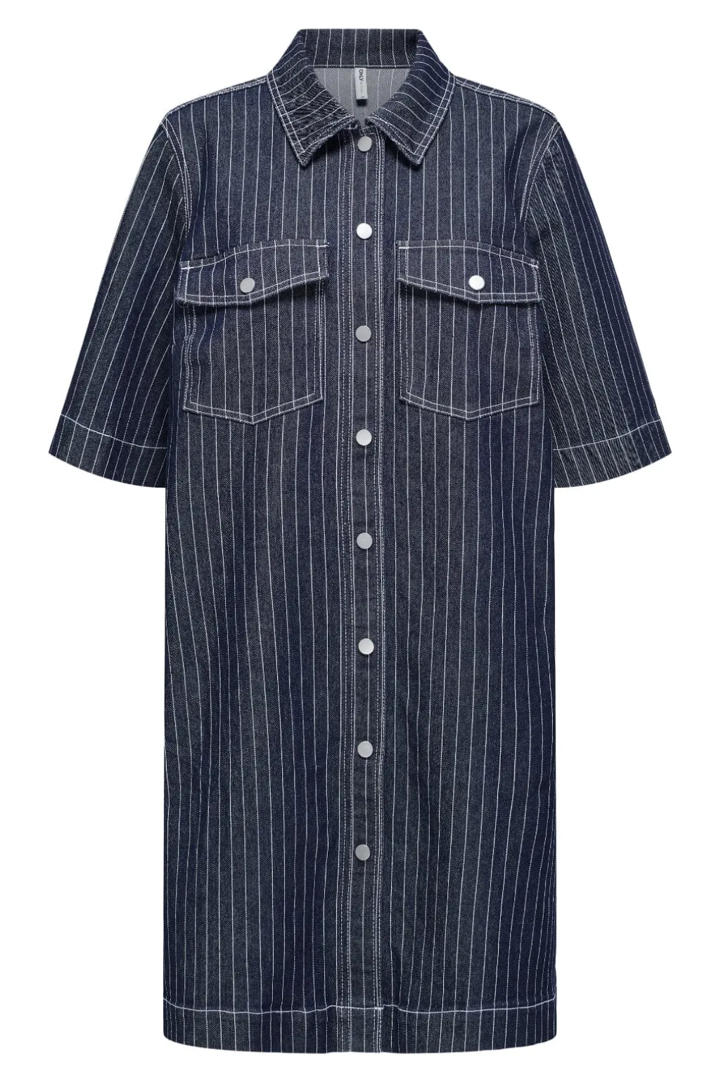 Stribet denimkjole fra Only med skjortekrave og knaplukning. Den mørkeblå kjole har praktiske brystlommer og korte ærmer, der giver et casual udtryk.