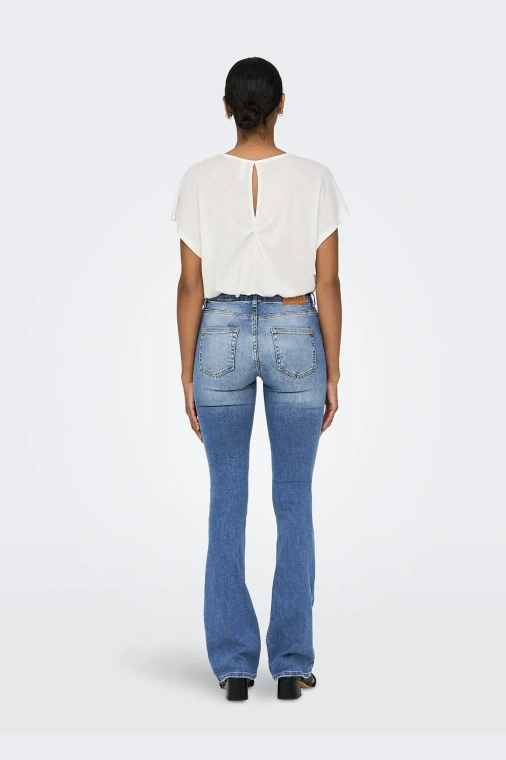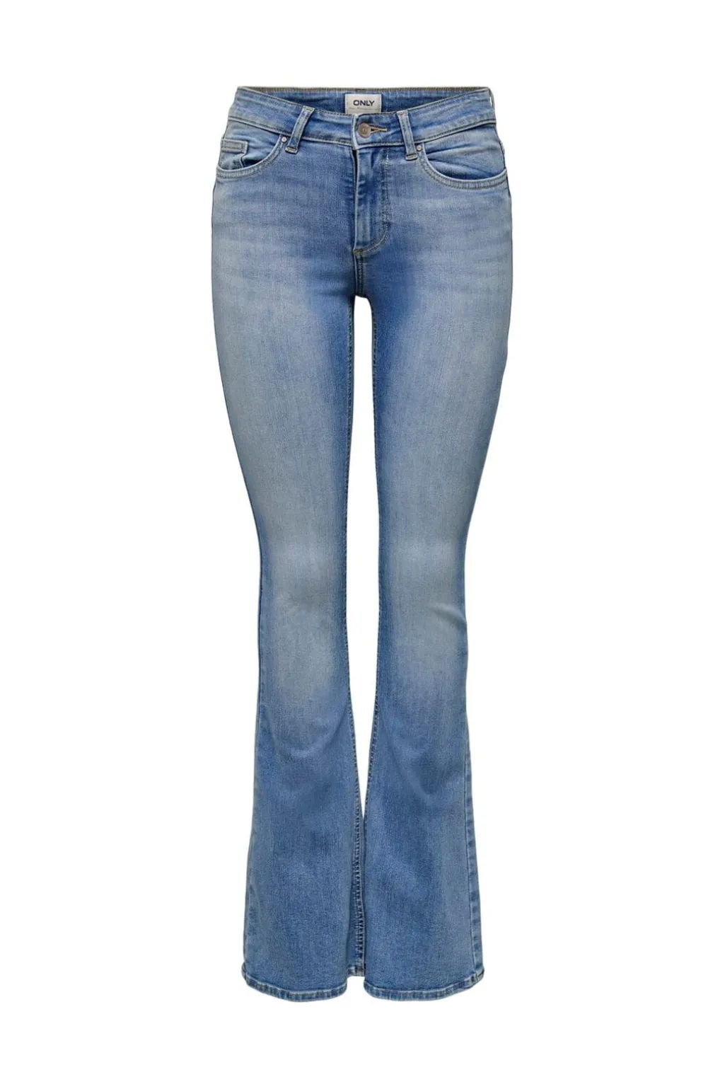 Flared jeans fra Only i lyseblå denim. Jeansene har en mellemhøj talje og en pasform, der sidder tæt omkring hofterne og bliver videre fra knæet.