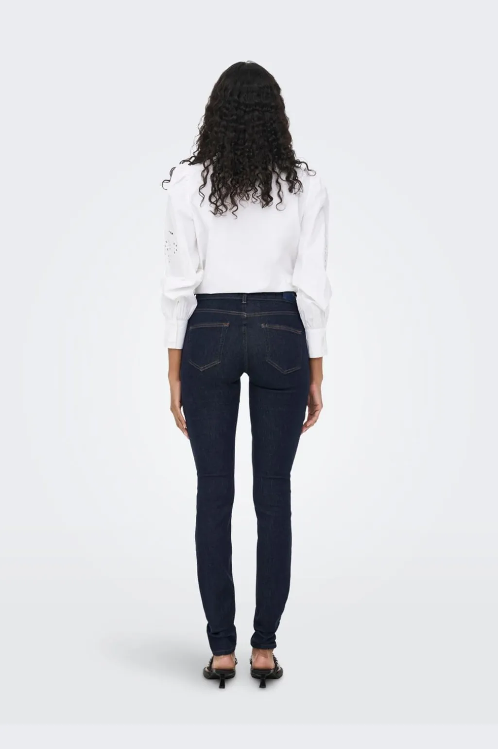 Mørkeblå denimjeans fra Only med slim fit-pasform og ankellængde. Jeansene har en regular waist og lukkes med lynlås og knapper foran.