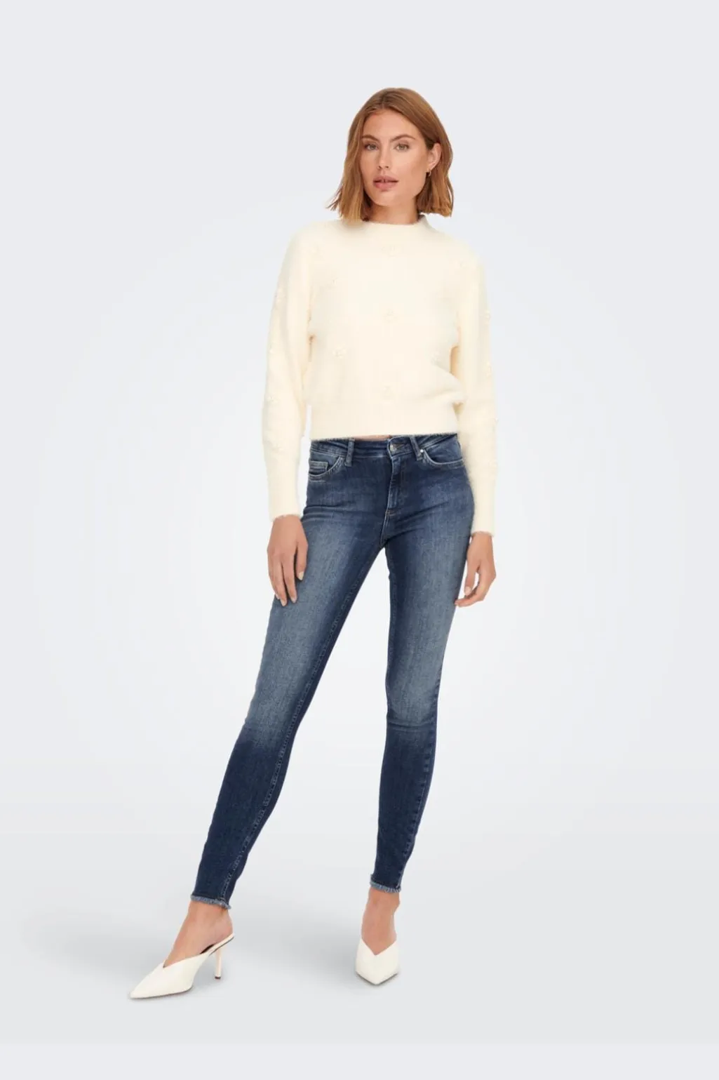 Mellemblå jeans fra Only i slim fit med ankellængde. Den regulære taljehøjde og den blå denimfarve gør bukserne nemme at style til forskellige looks.