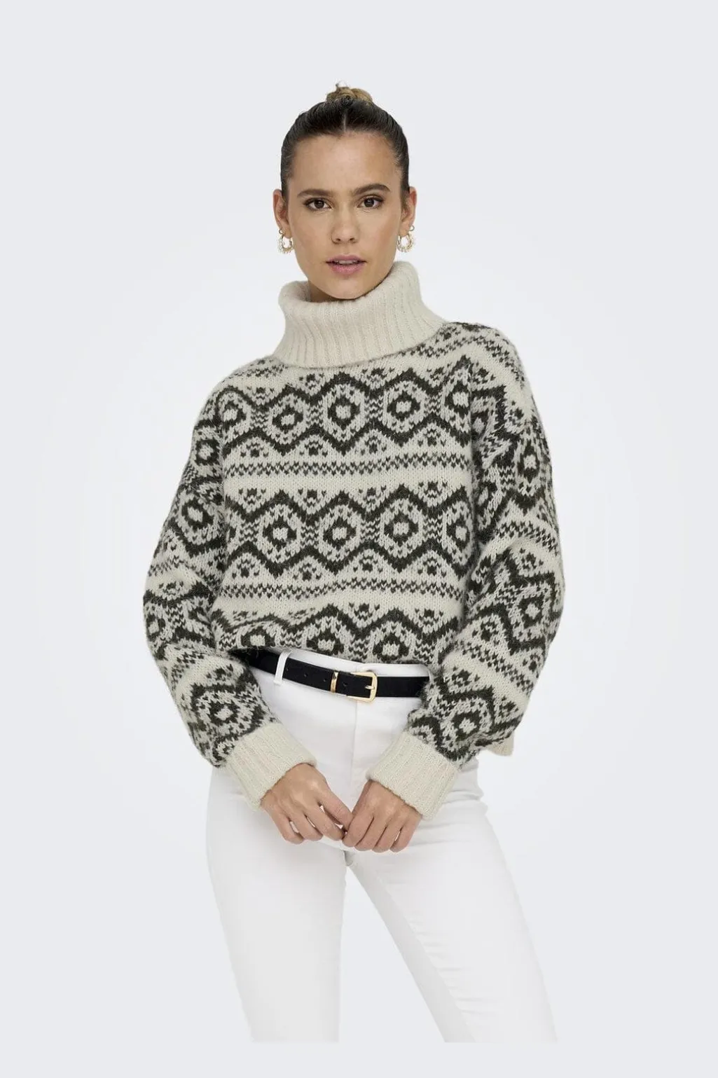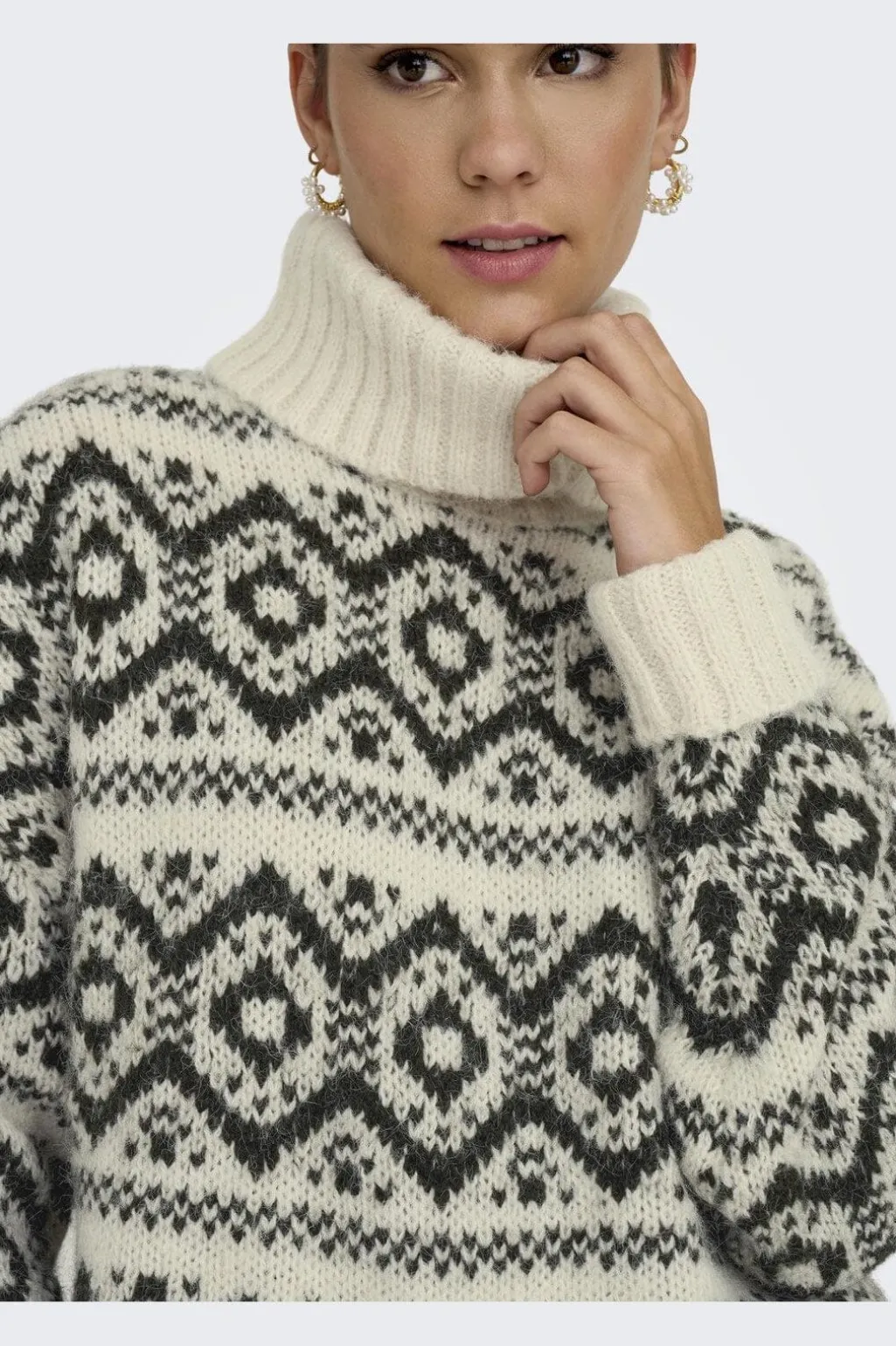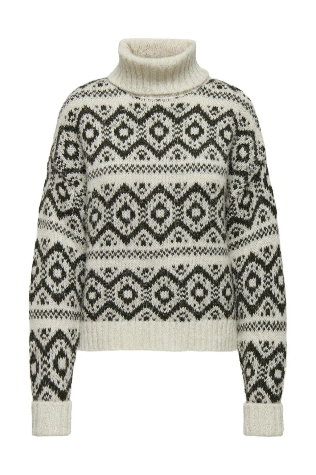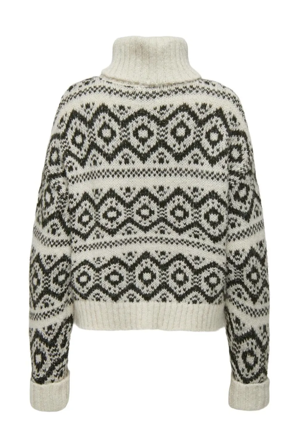 Striktrøje fra Only med geometrisk mønster i birk- og harpiksnuancer. Den høje rullekrave og løse pasform giver en god kombination af stil og komfort.