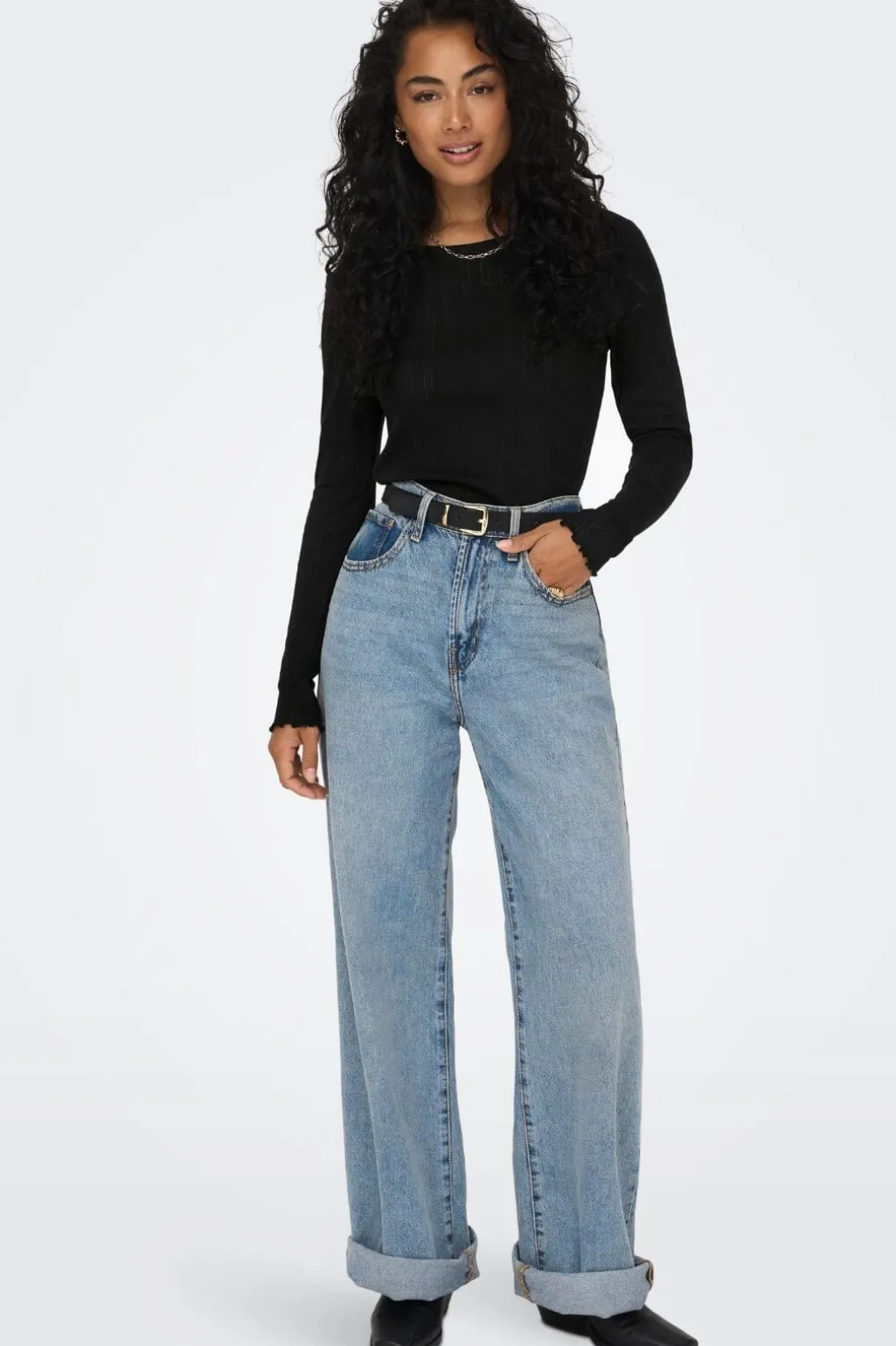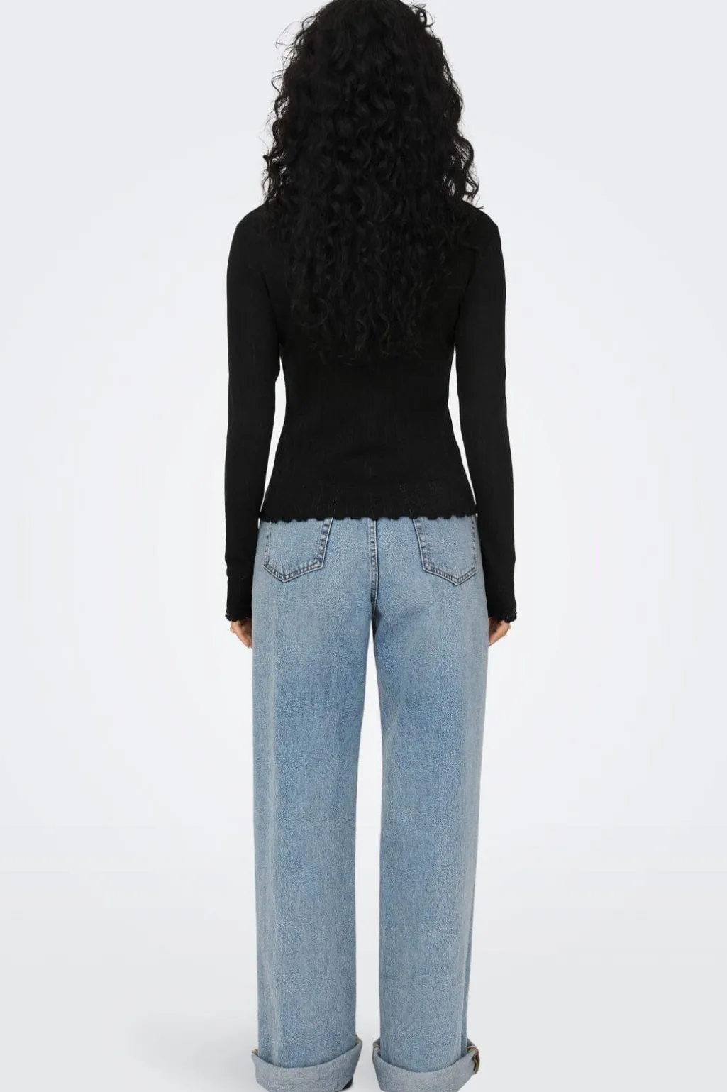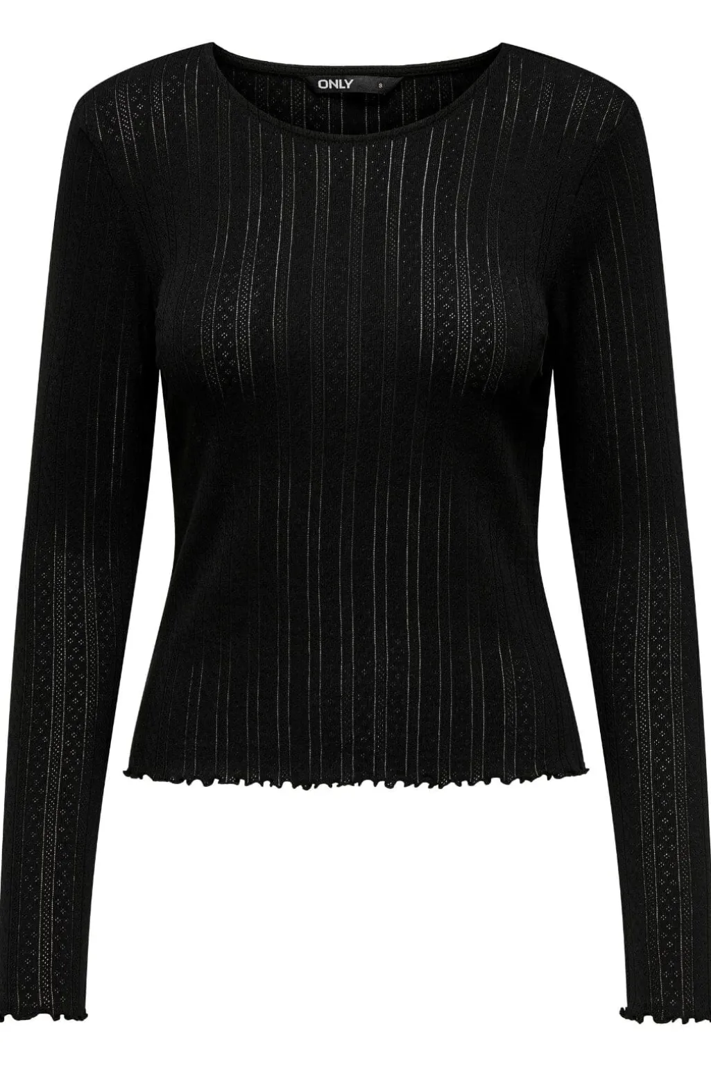 Sort top fra Only med lange ærmer og ribbet design. Toppen har lodrette striber og en rund halsudskæring med scallop-kant og flæser, der giver et feminint præg.