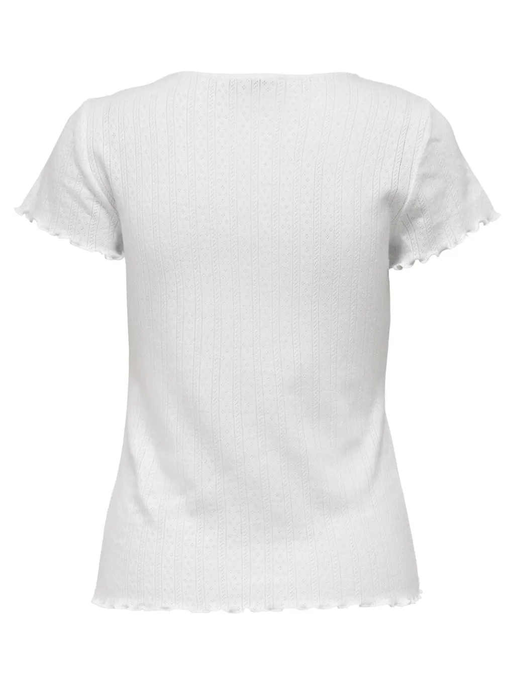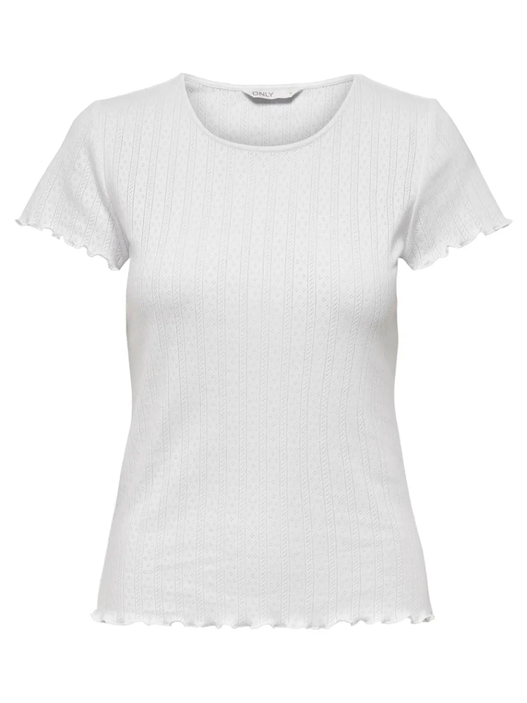 Hvid kortærmet top fra Only med ribbet tekstur. Toppen har en tætsiddende pasform, rund halsudskæring og bølgede kanter på ærmerne, der giver et feminint præg.