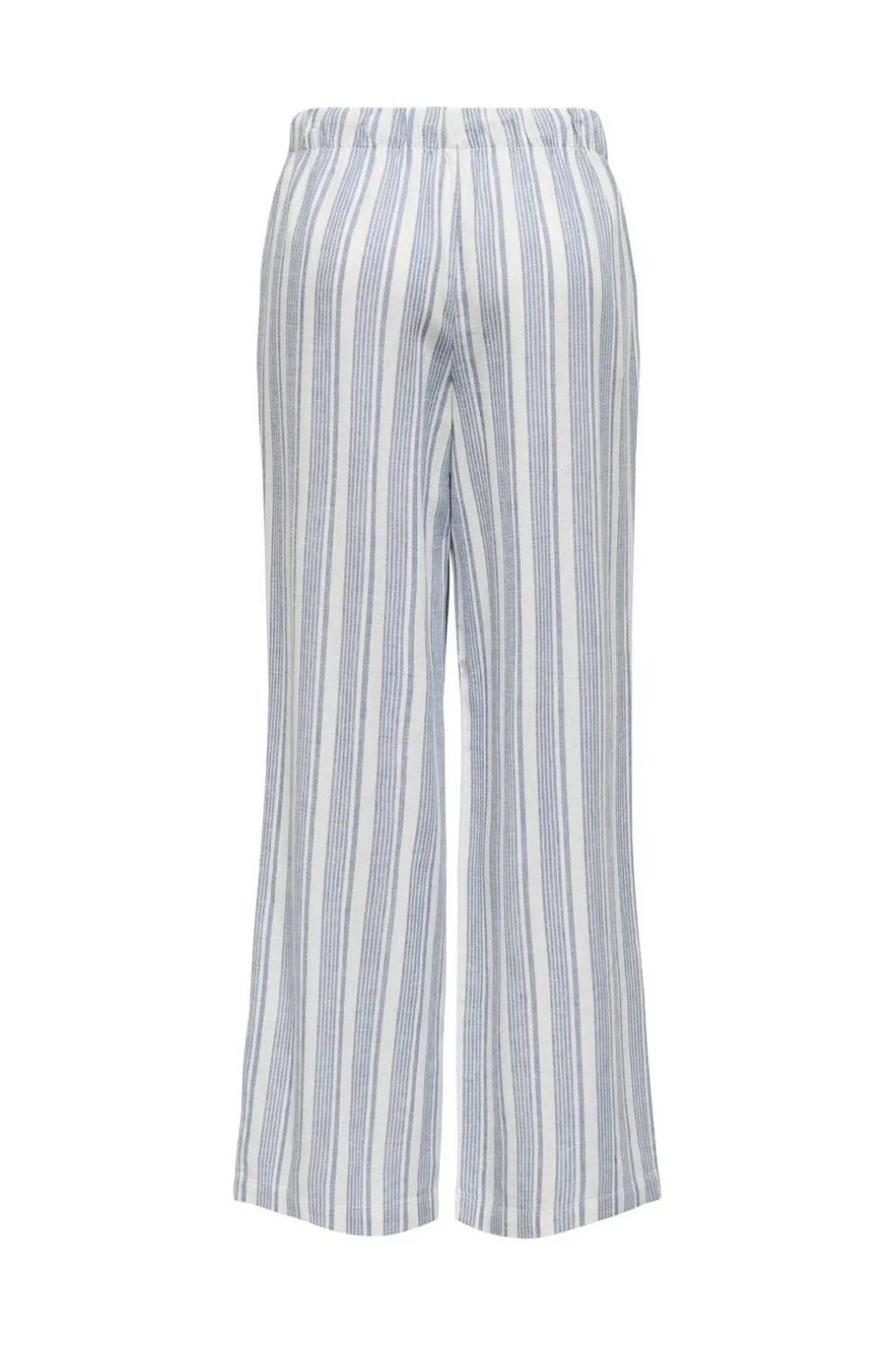 Stribede bukser fra Only i lyseblå og hvid. De har en løs pasform og lang længde med et maritimt inspireret mønster. Bukserne kommer med bindebånd i taljen.