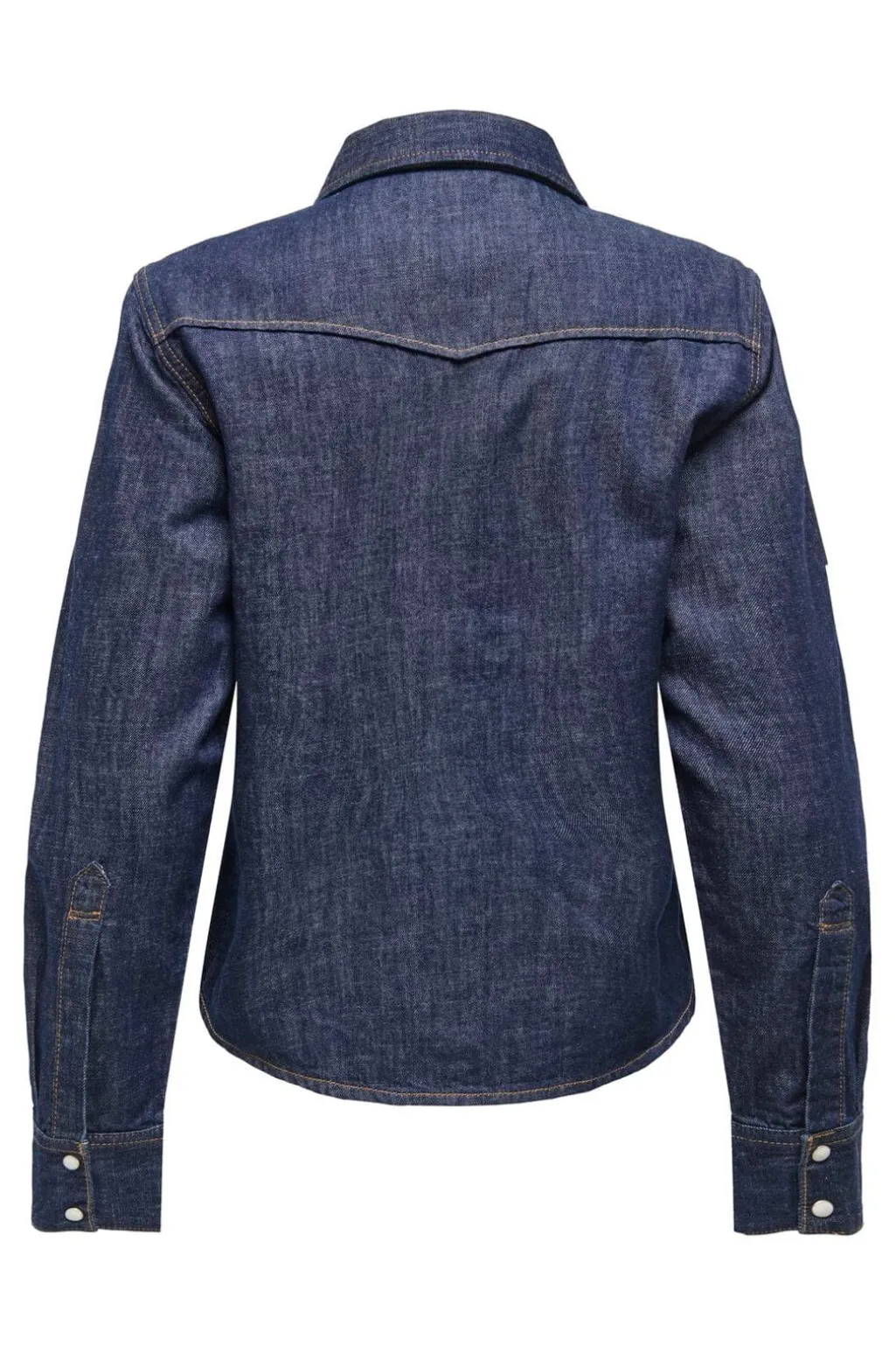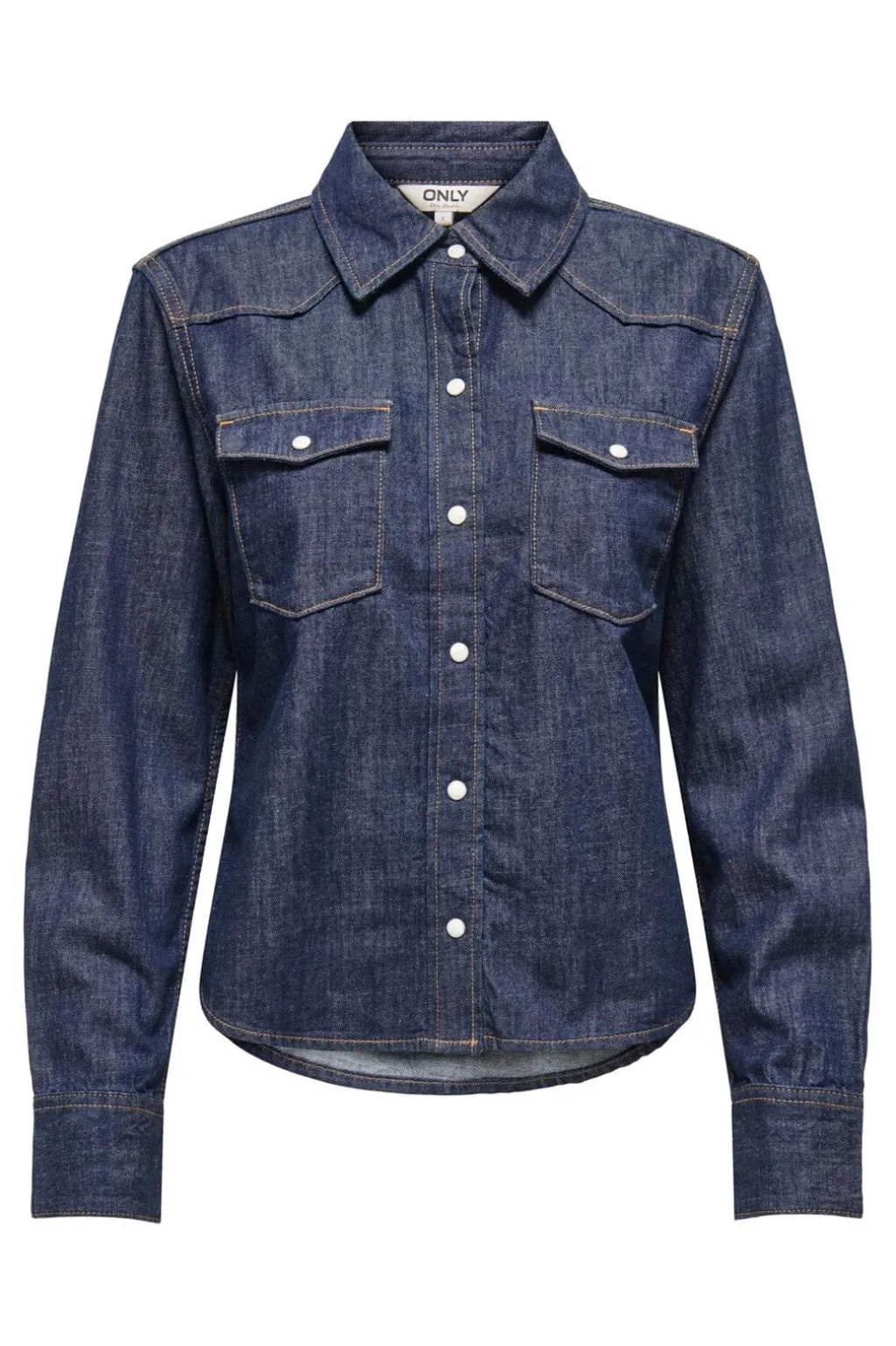 Denimskjorte fra Only i mørkeblå rinse-vask. Skjorten har en klassisk skjortekrave og to brystlommer med knaplukning. Dekorative syninger og perledetaljer giver skjorten et ekstra pift.