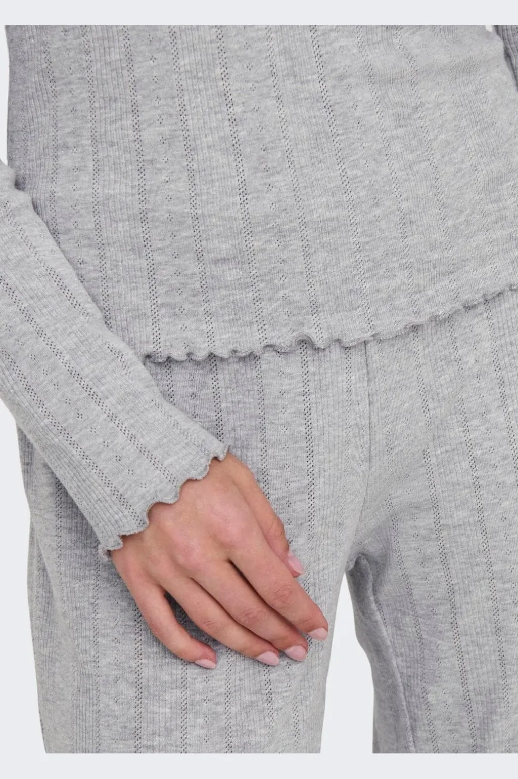 Pyjamassæt fra Only, lavet af 50 % bomuld og 50 % polyester i en lys grå meleret nuance. Sættet har en ribbet tekstur og rynkede kanter ved ærmerne og buksebenene.
