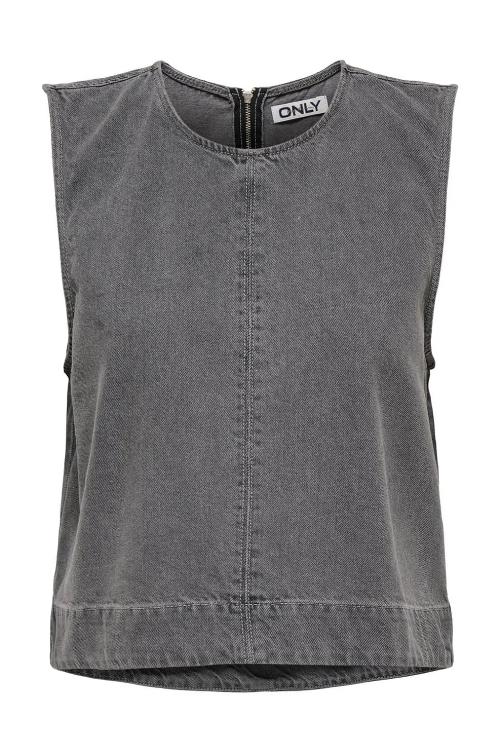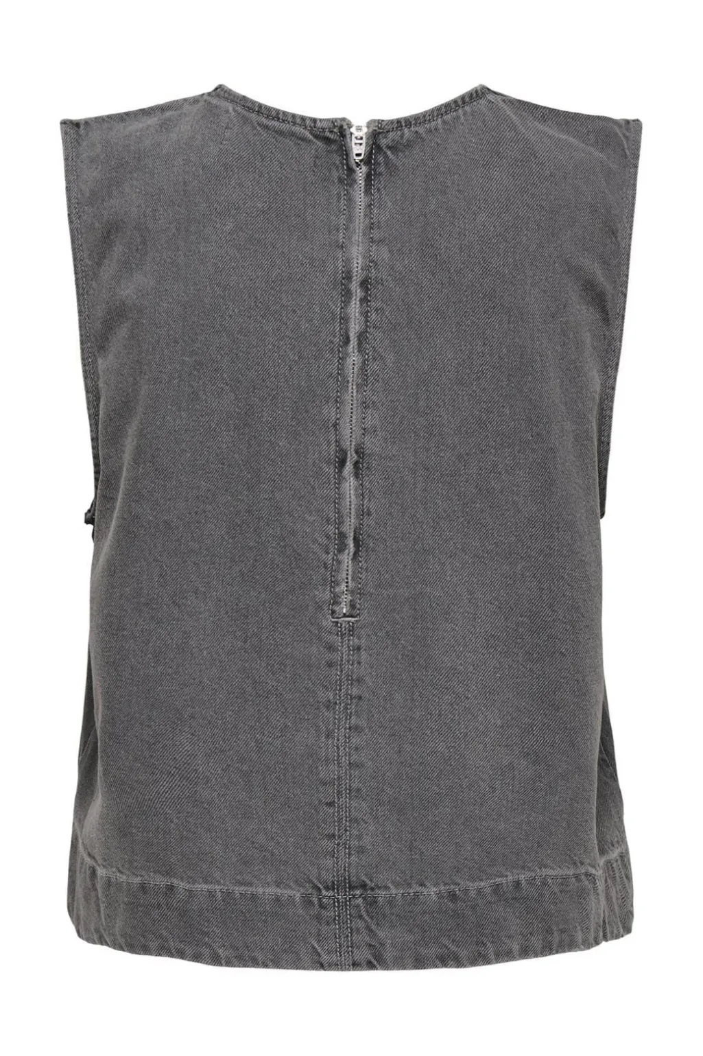 Ærmeløs top fra Only i grå denim. Toppen har en rund halsudskæring og dekorative syninger, der giver et casual udtryk. Lynlåsen bagpå gør den nem at tage af og på.