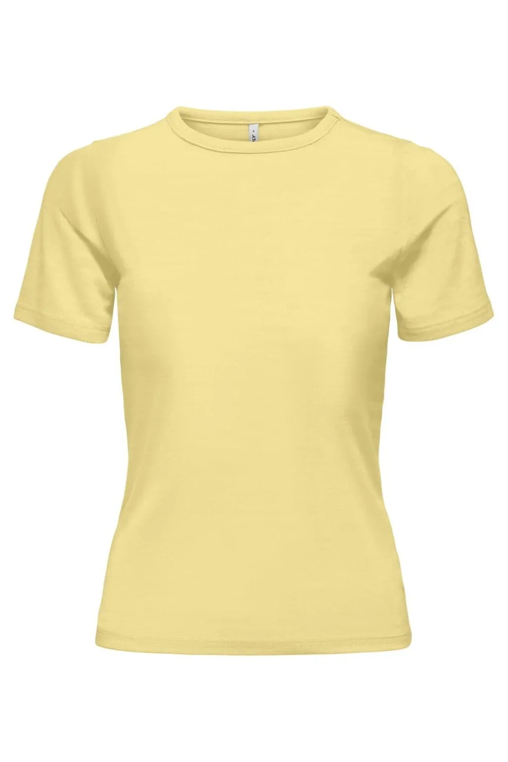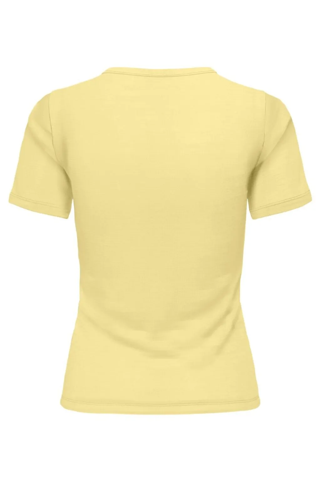 Ribstrikket top fra Only i en lys citrongul farve. Toppen har korte ærmer og en rund halsudskæring.