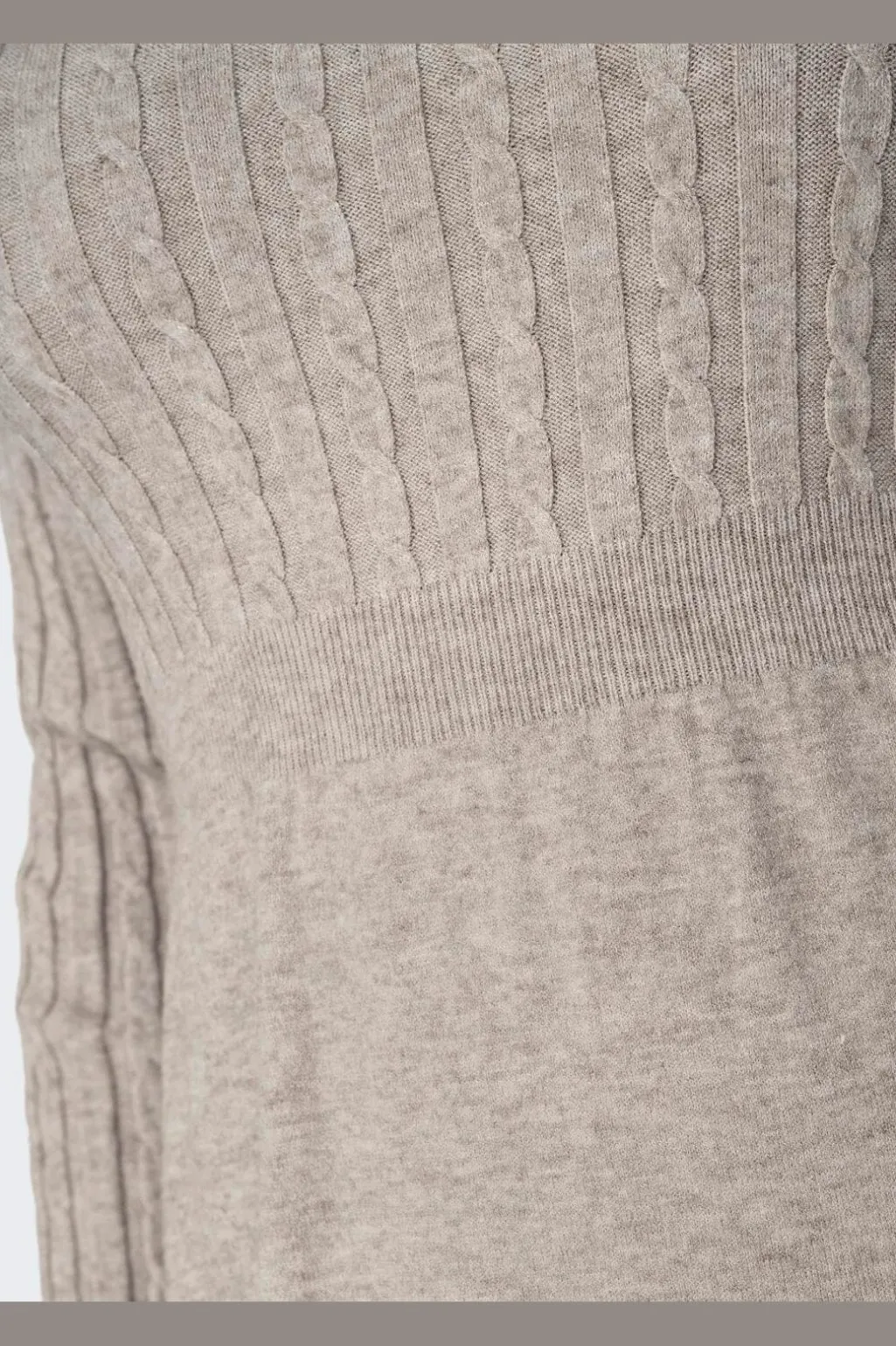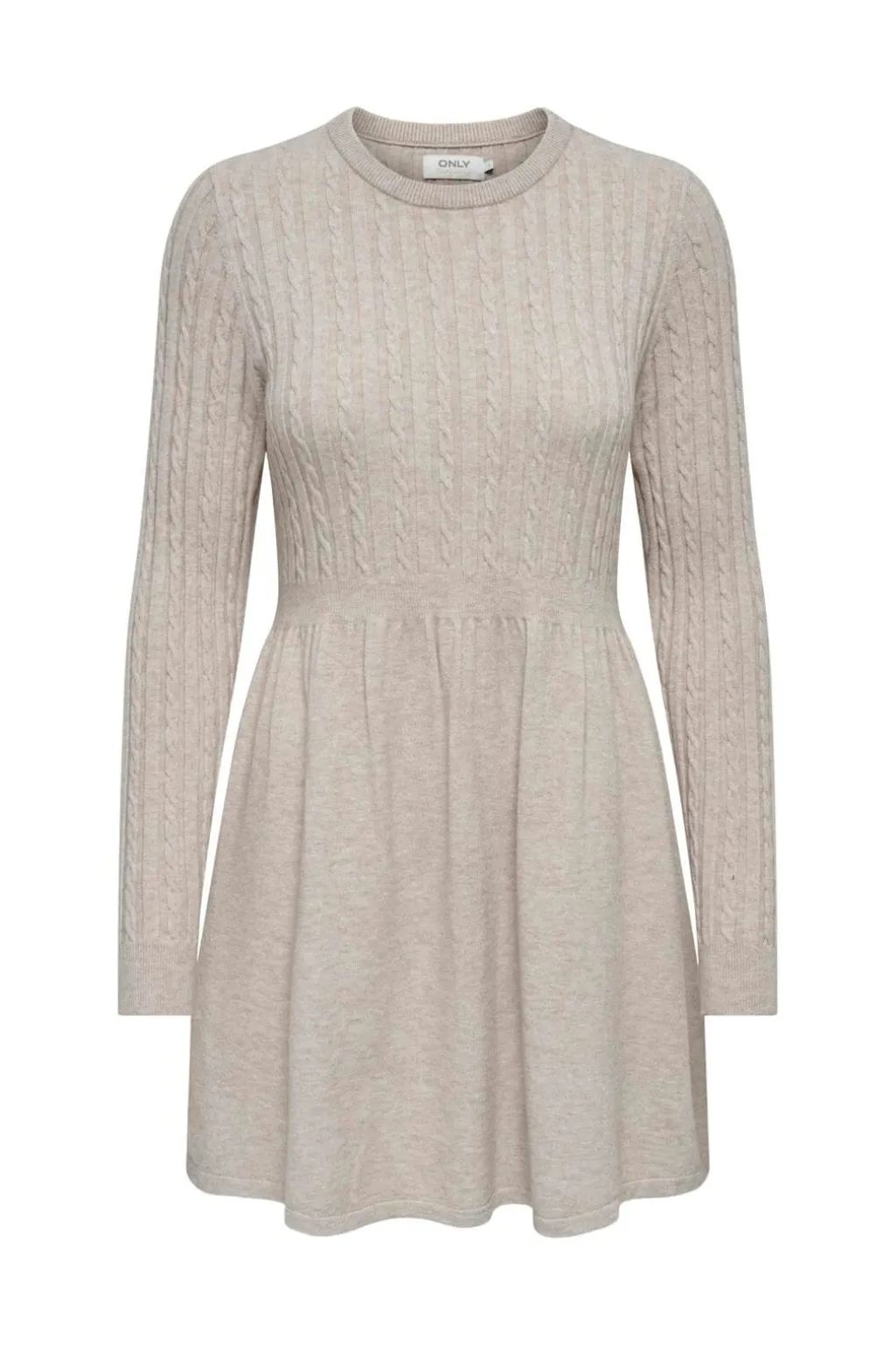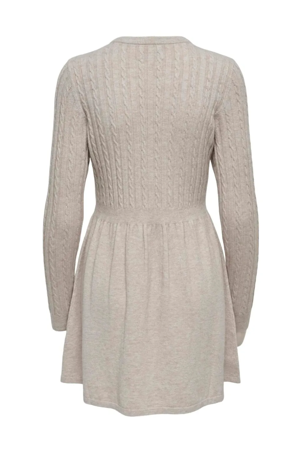 Strikket kjole fra Only i grå og beige melange nuancer. Kjolen har kabelstrik på overdelen og ærmerne samt en rund halsudskæring.
