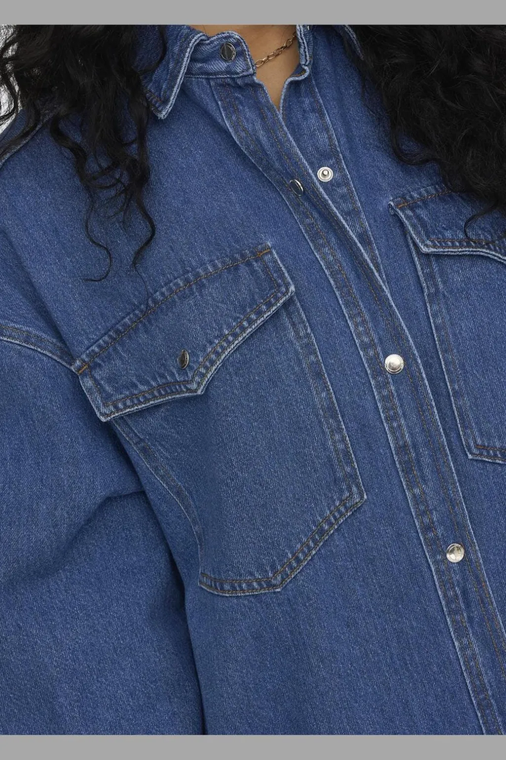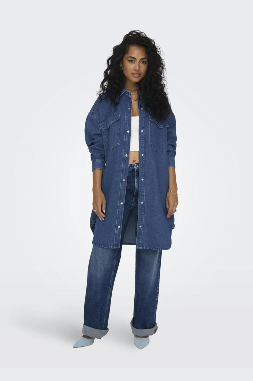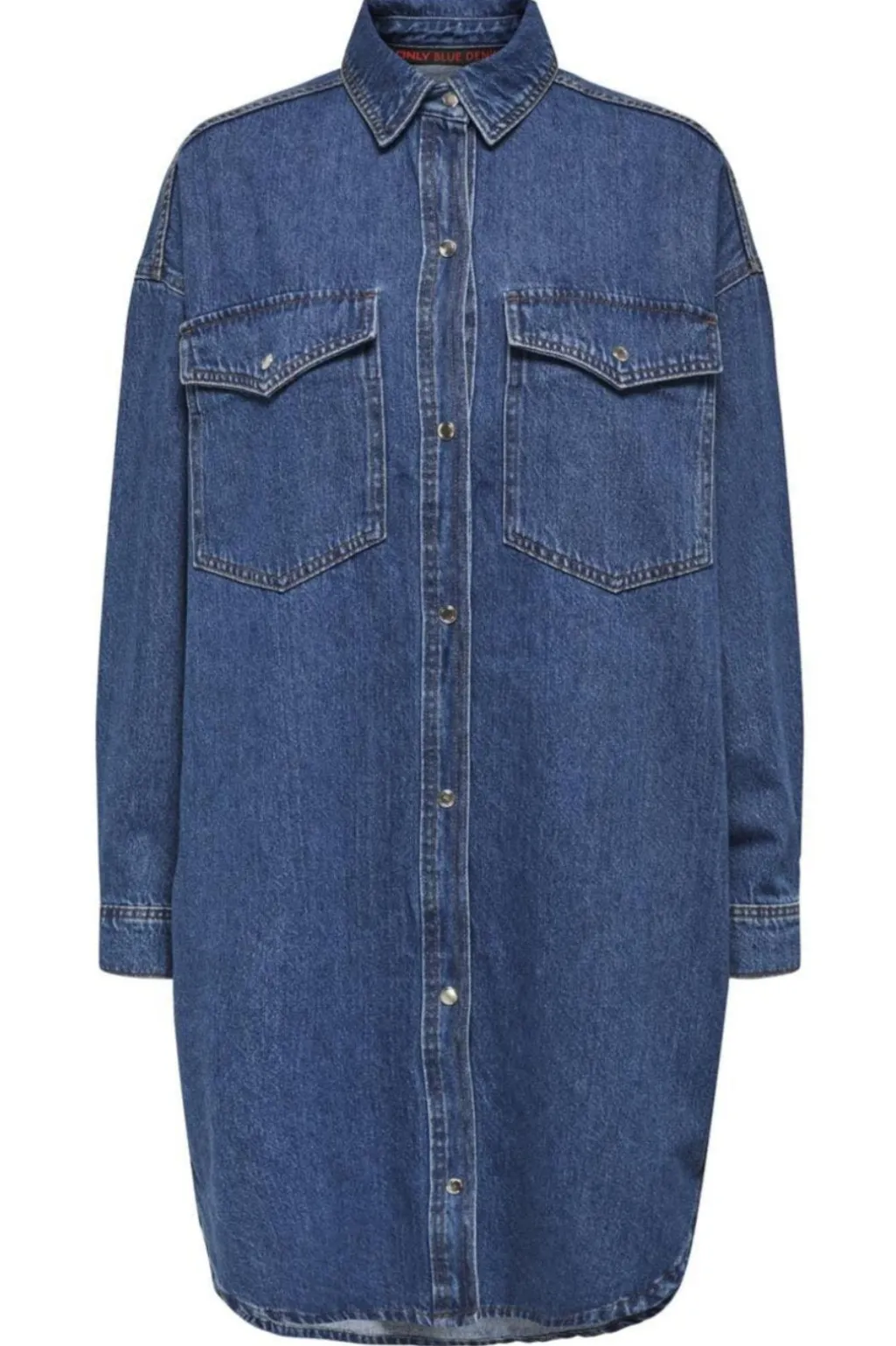 Denimkjole fra Only i medium blå denim. Kjolen har en skjortekrave, knaplukning foran og to brystlommer. Den oversized pasform giver en afslappet stil.