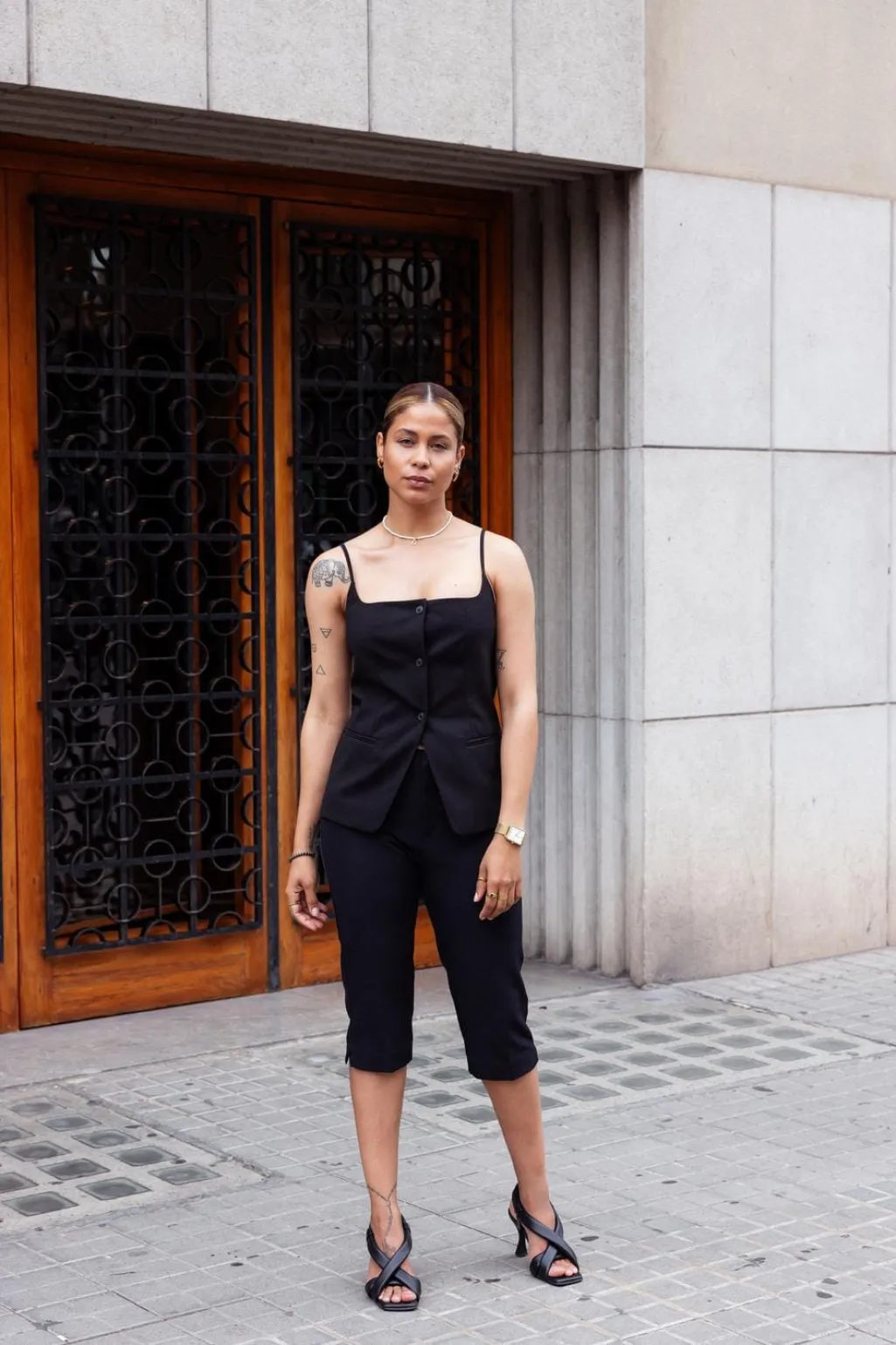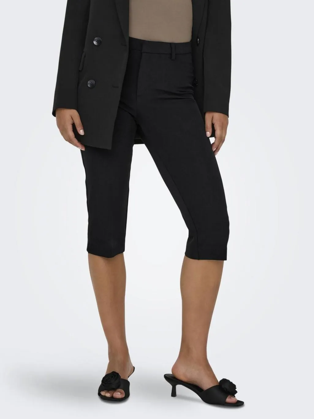 Sorte capri-bukser fra Only med slim fit og mellemhøj talje. Bukserne har en knælang model med bæltestropper samt lynlås- og knaplukning i gylpen.