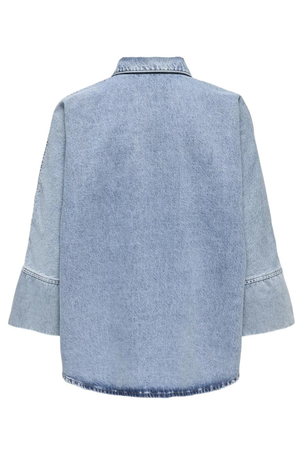Lyseblå denimskjorte fra Only med sløjfedetaljer. Skjorten har en løs pasform og skjortekrave med knapper hele vejen ned.