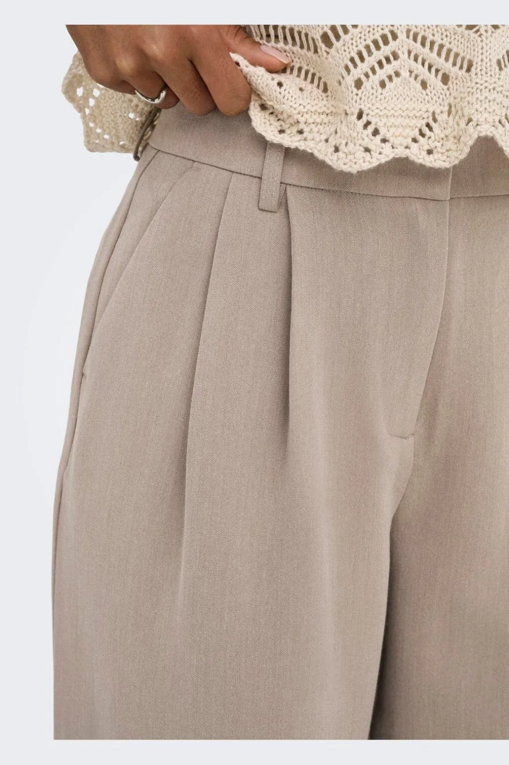 Bukser fra Only i en meleret gråbrun nuance. Bukserne har brede ben og læg ved taljen.
