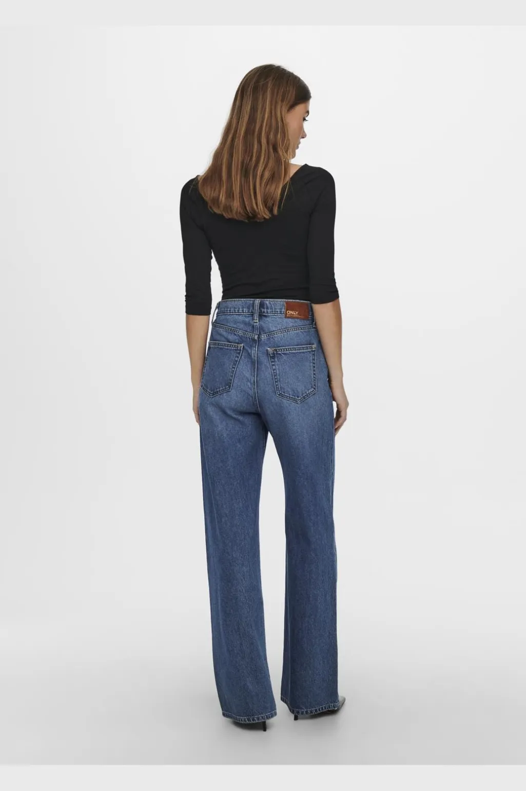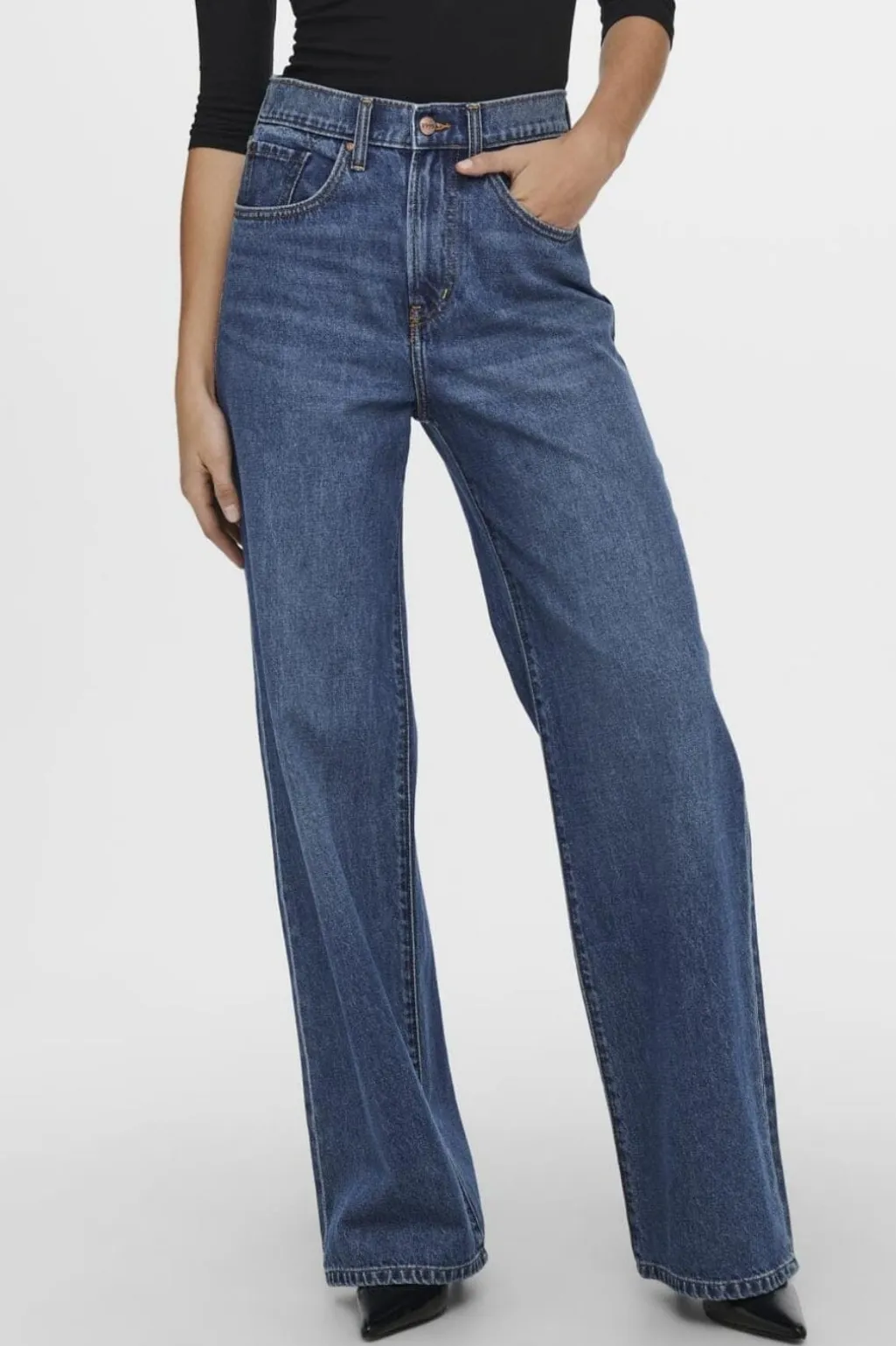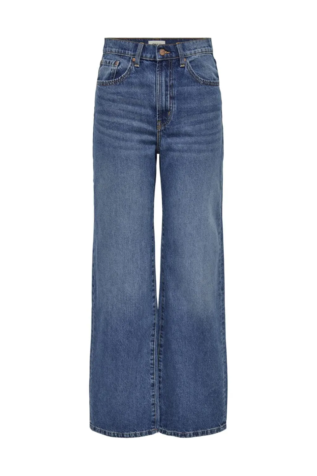 Brede jeans fra Only i mellemblå denim. De har en høj talje og en løs pasform med brede ben, der går ned til anklerne. Jeansene har både for- og baglommer.