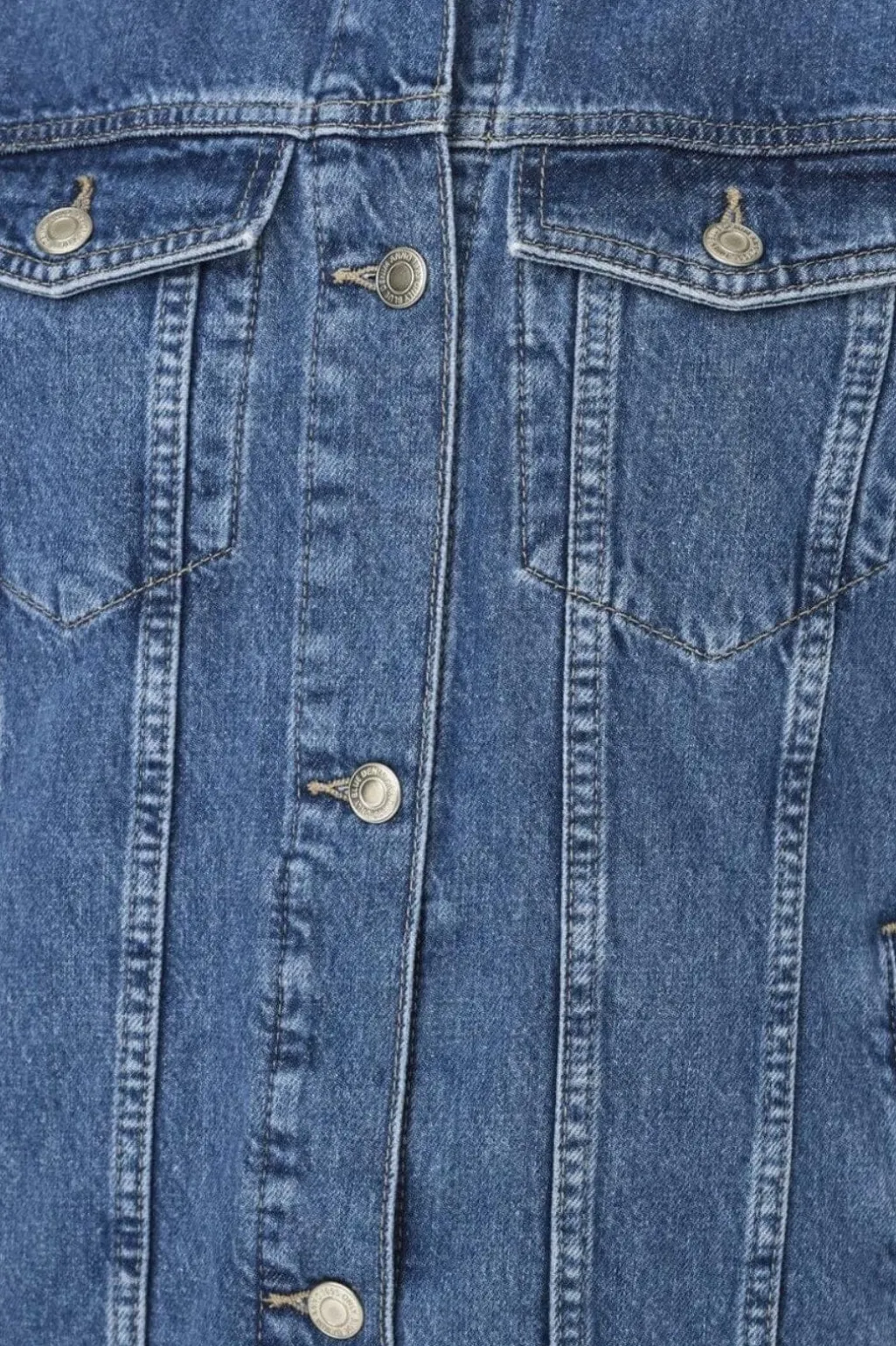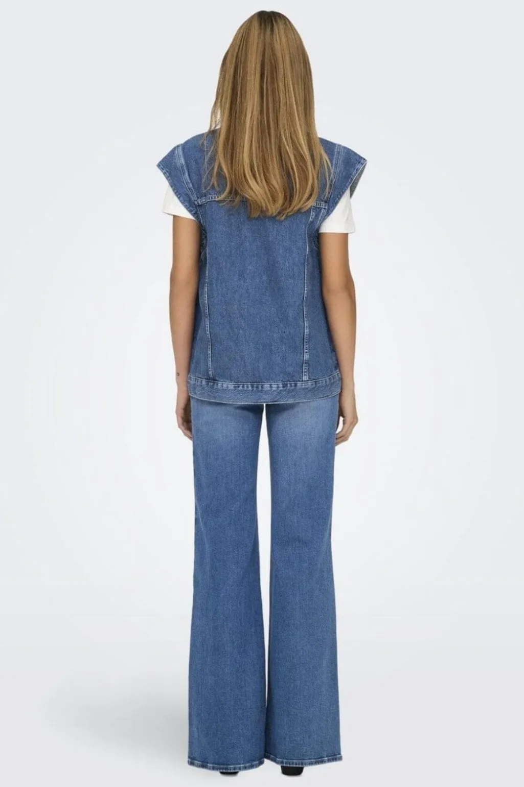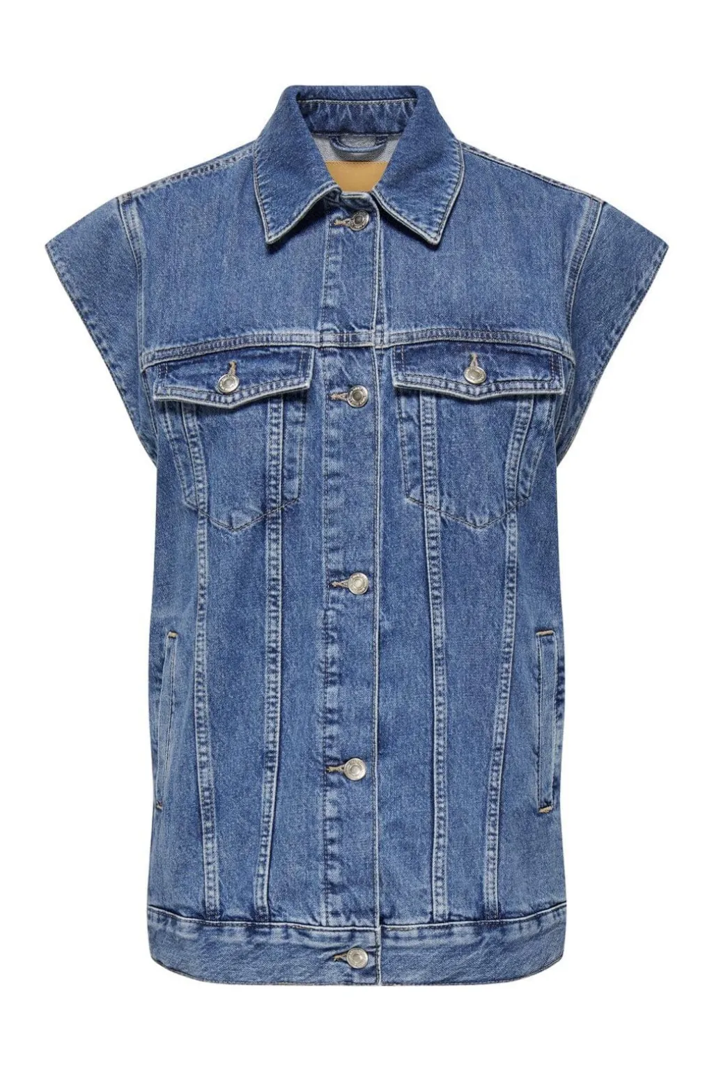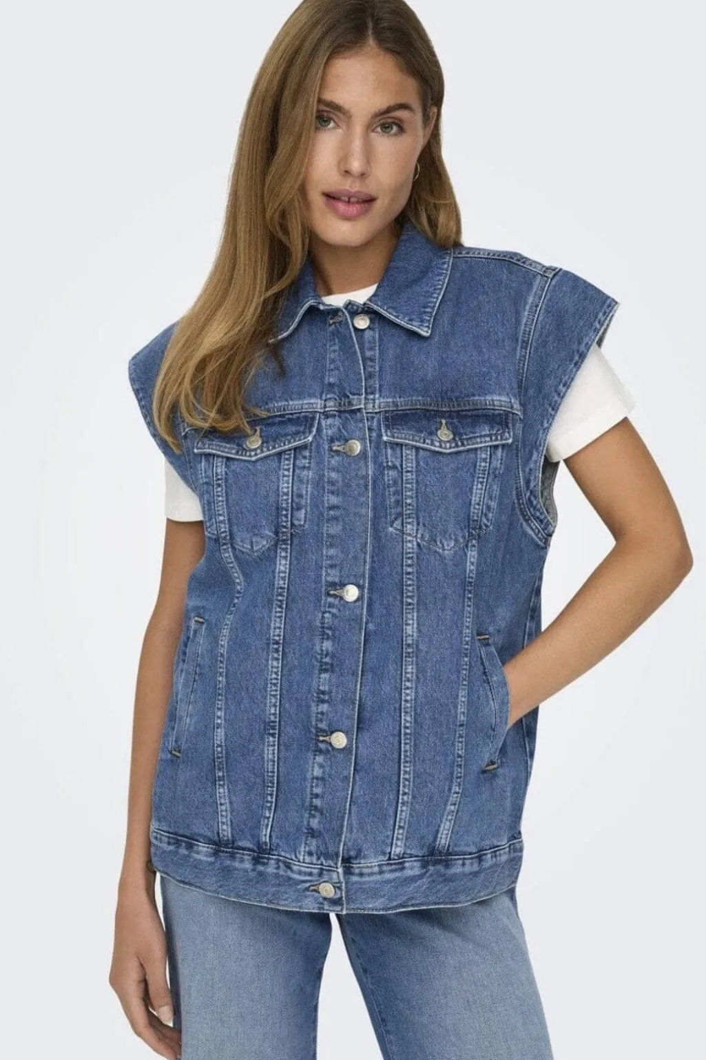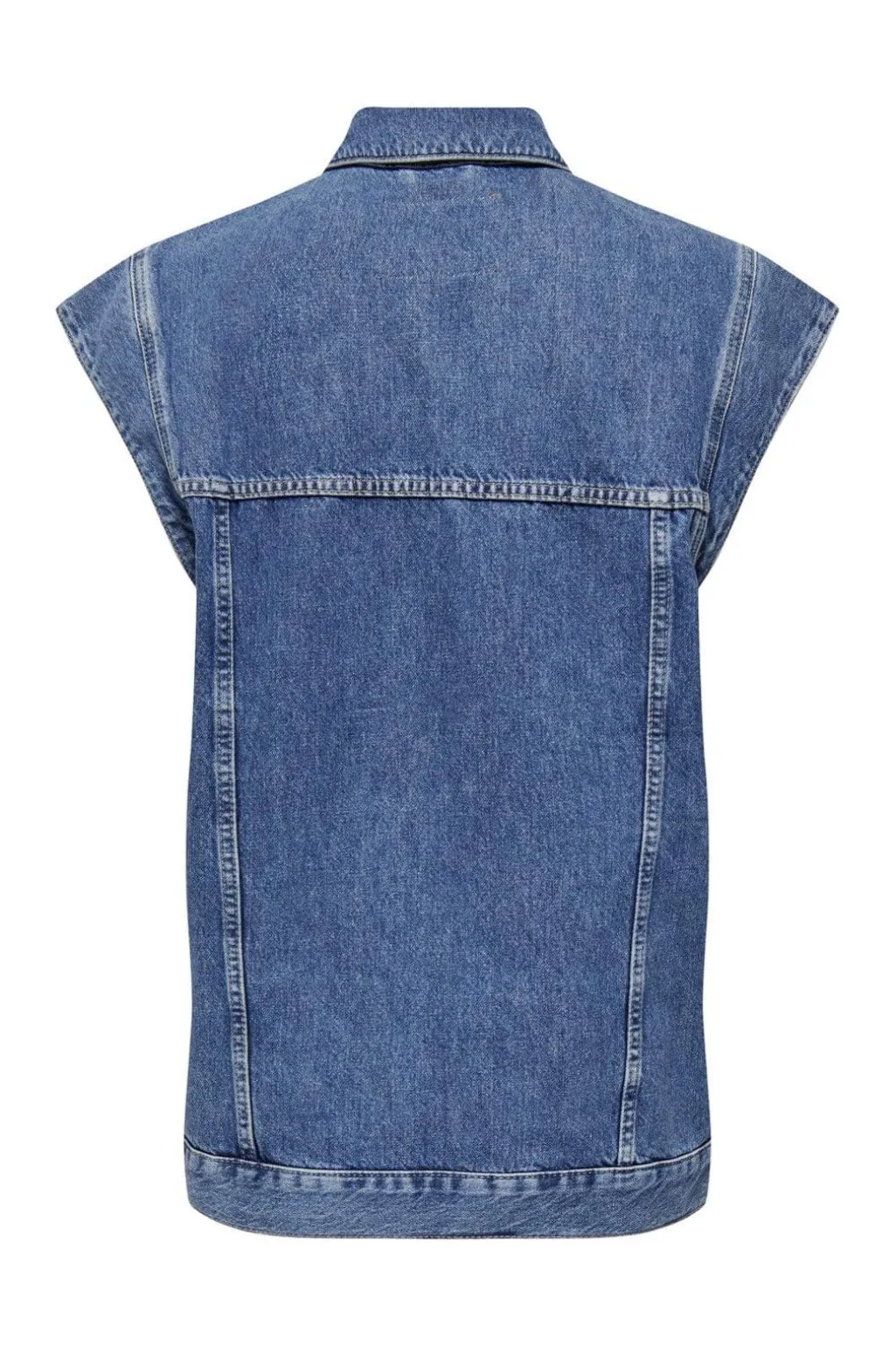 Denimvest fra Only i mellemblå denim med løs pasform. Vesten har spredt skjortekrave og knapper foran. Brystlommer med knaplukning og sidelommer giver praktisk opbevaring.