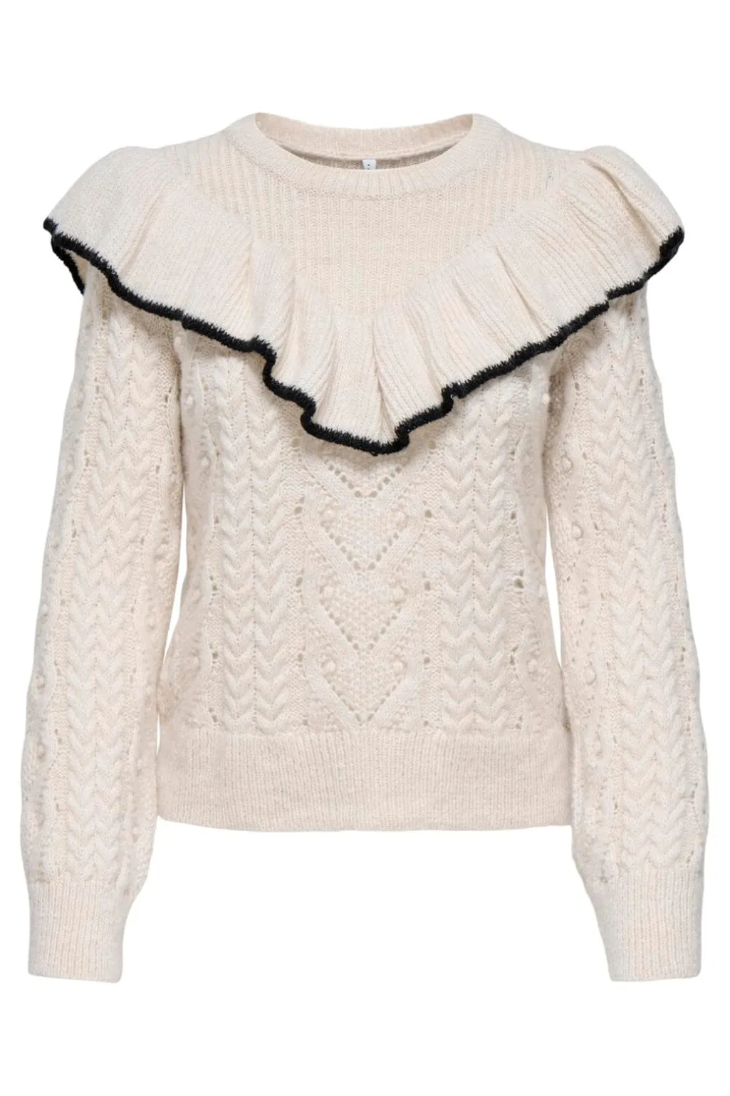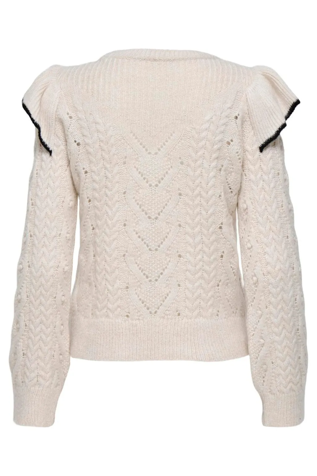 Striktrøje fra Only i en lys birk-sorte nuance. Den har en rund halsudskæring med flæsedetalje og sort kant, lange ærmer og et kabelstrikket mønster over hele trøjen.