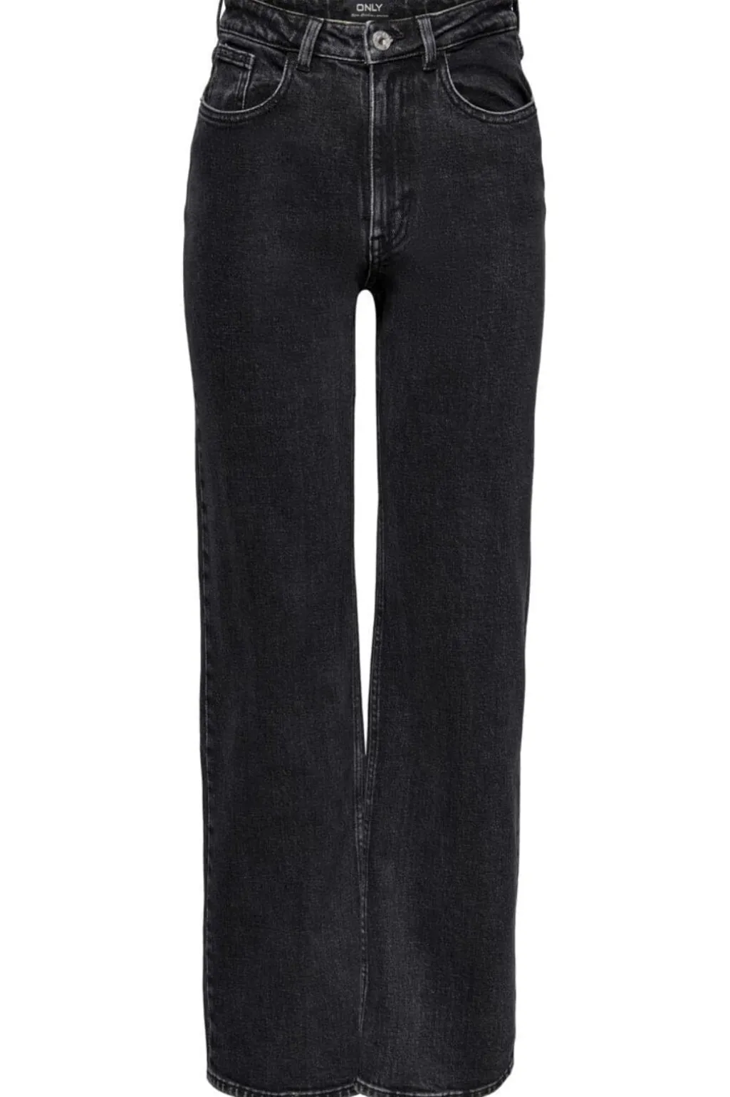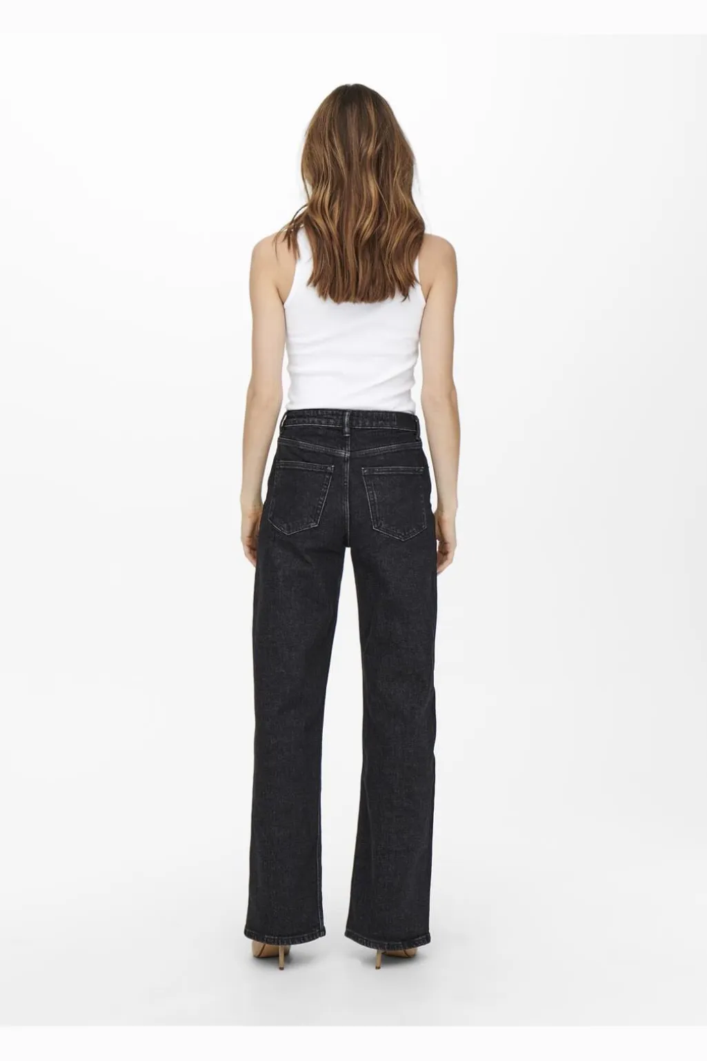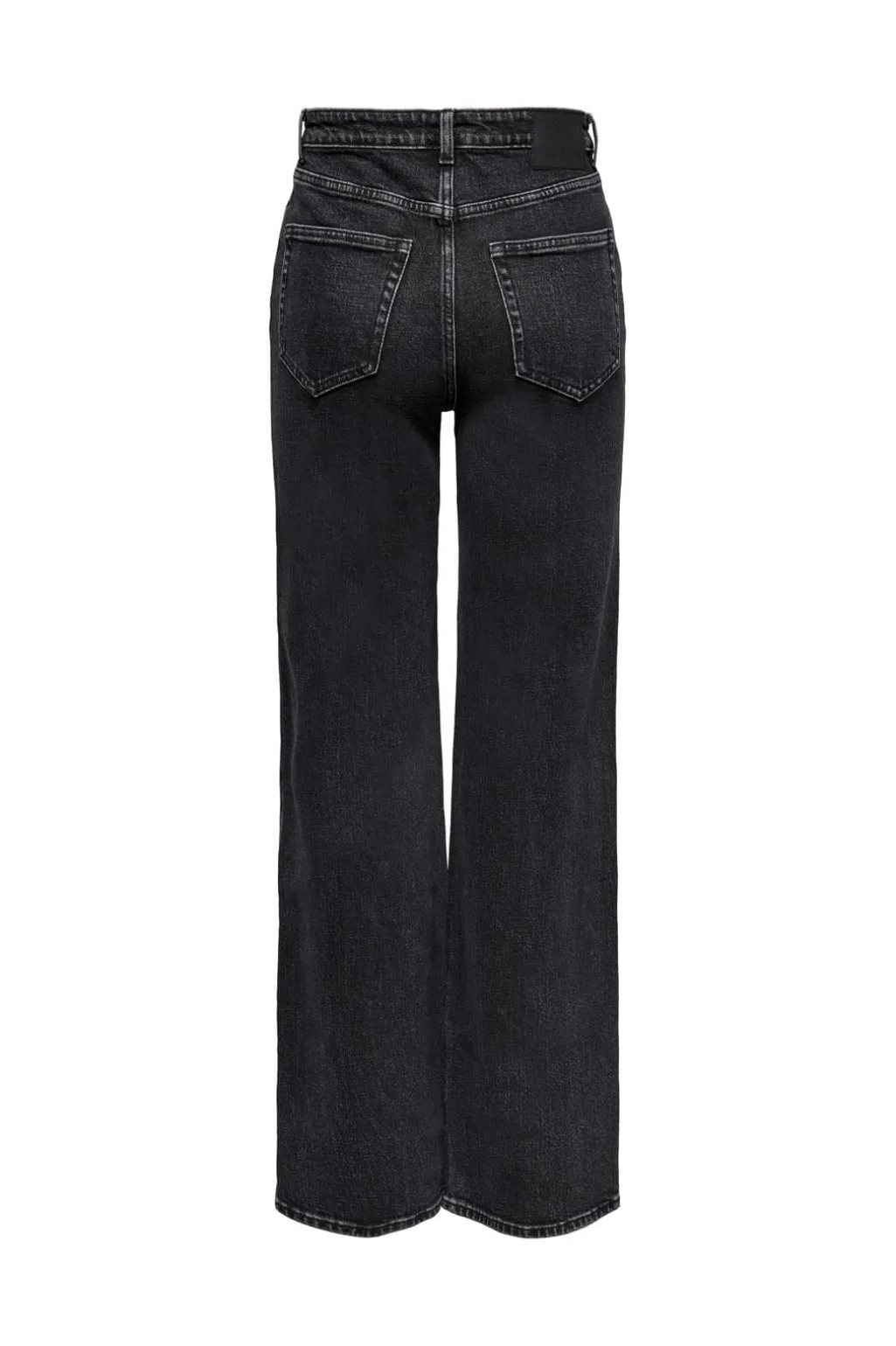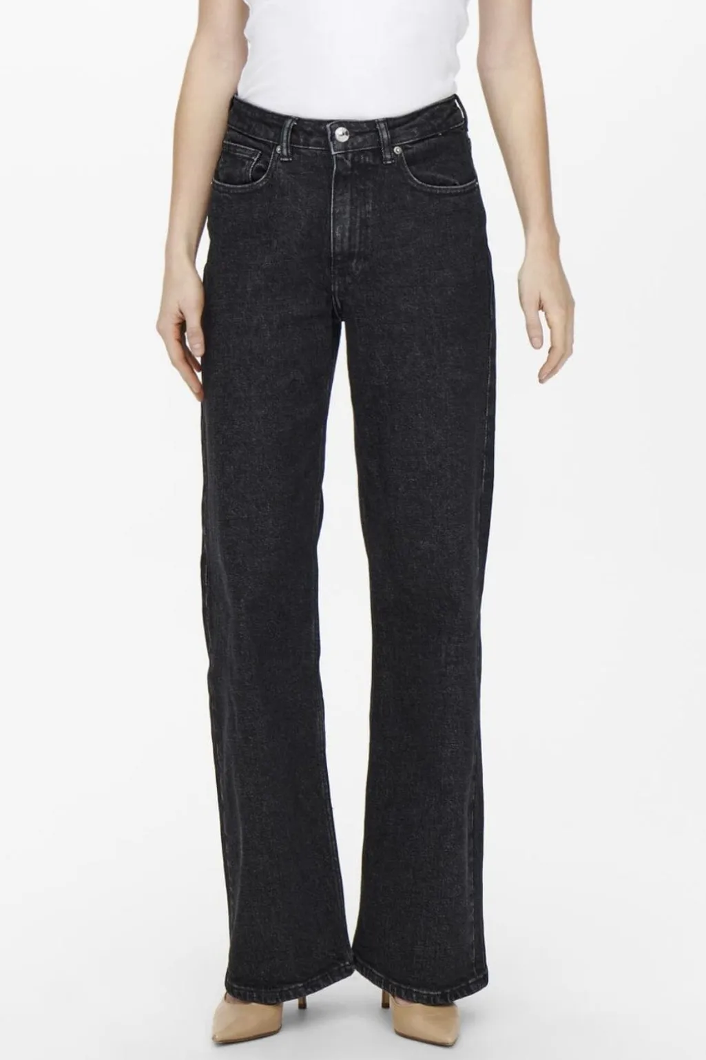 Sorte denimjeans fra Only med høj talje og vide ben. Bukserne har en loose fit fra hofte til ankel og er lavet i en ensfarvet sort denim.
