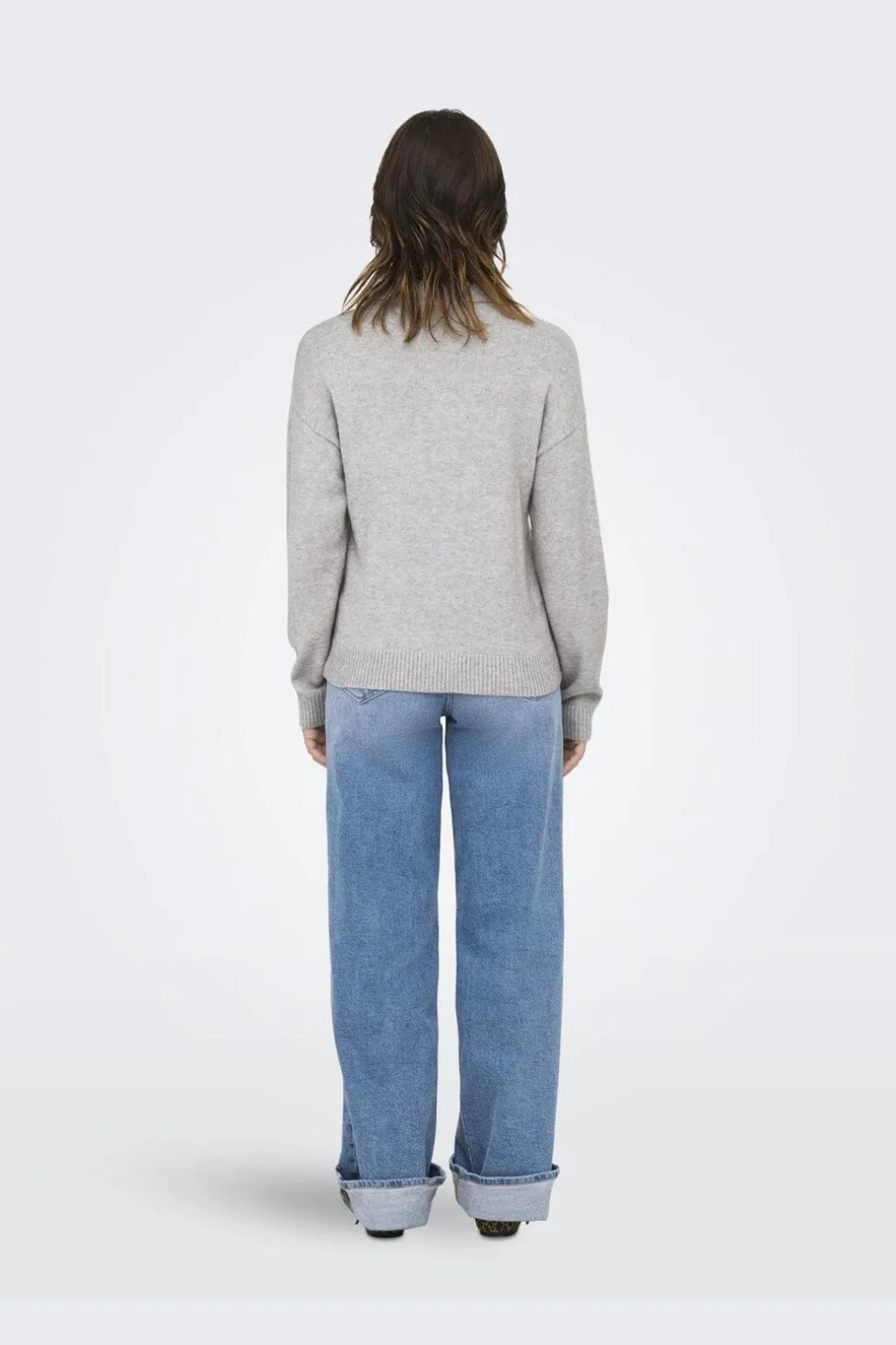 Lys grå strikket pullover fra Only med polokrave og knaplukning. Den har lange ærmer med manchetter og en ribkant forneden.