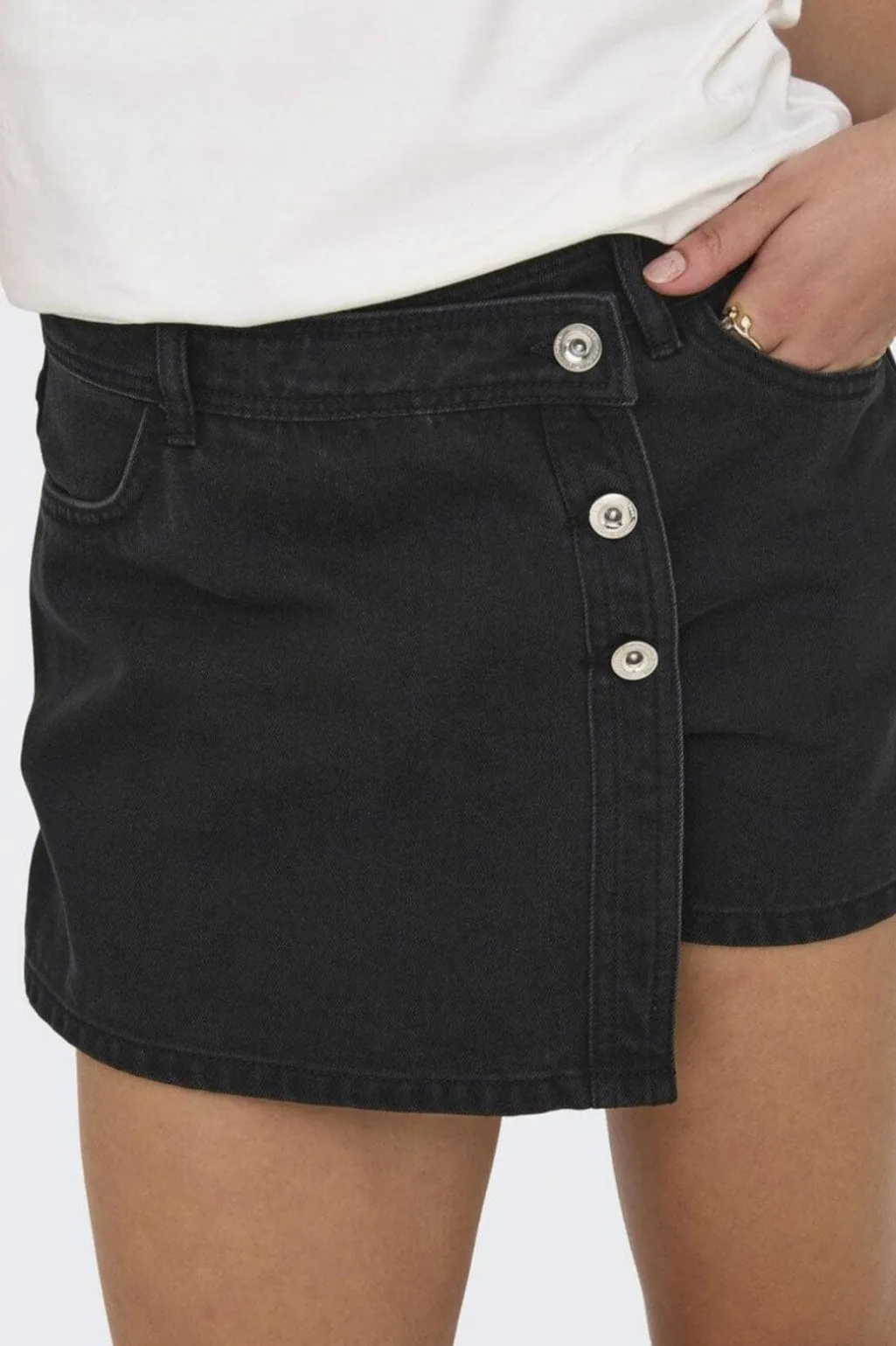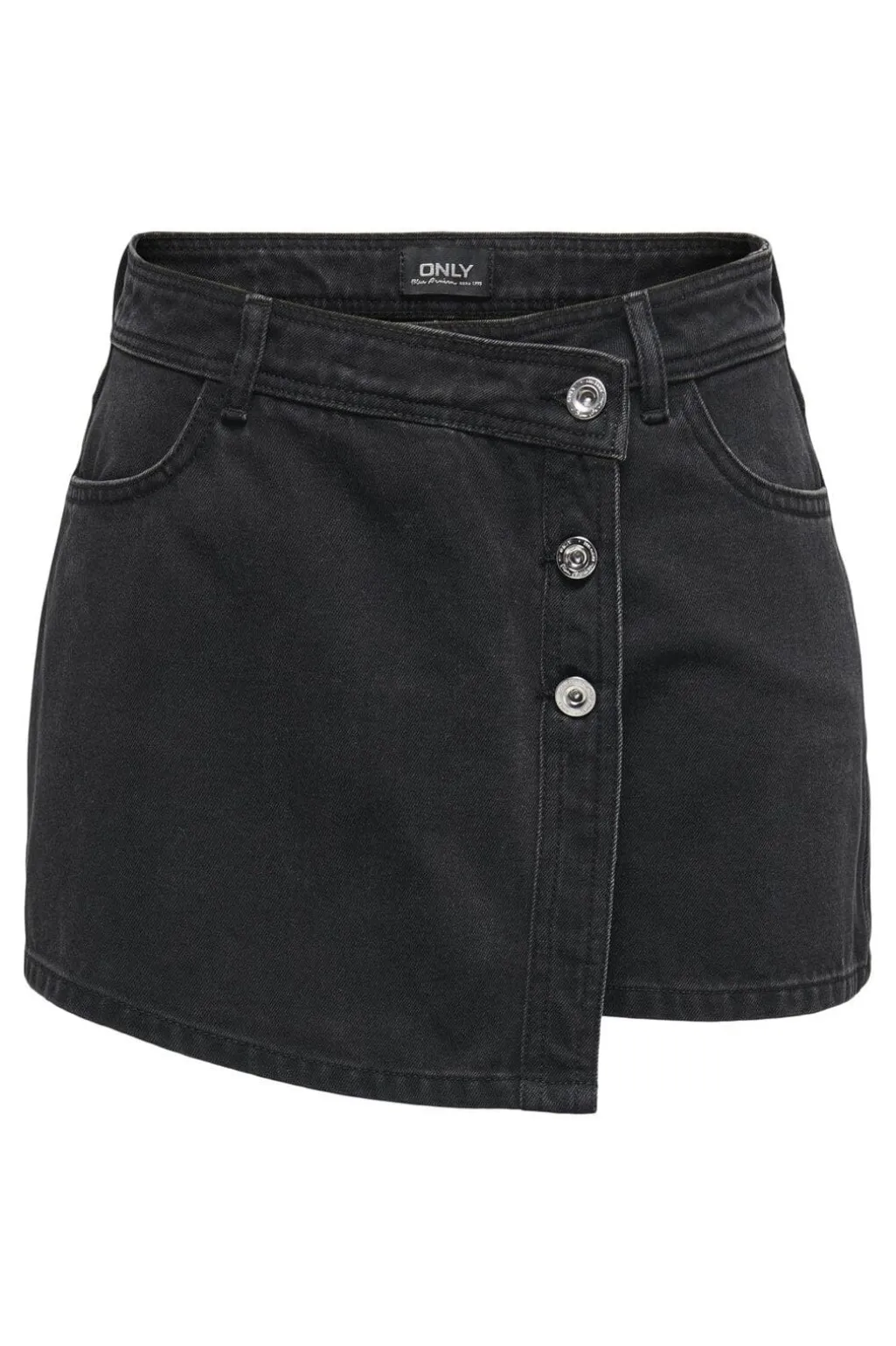 Sort denim skort fra Only med mellemhøj talje og bæltestropper. Den asymmetriske front har tre synlige knapper, og skorten kommer med både for- og baglommer.