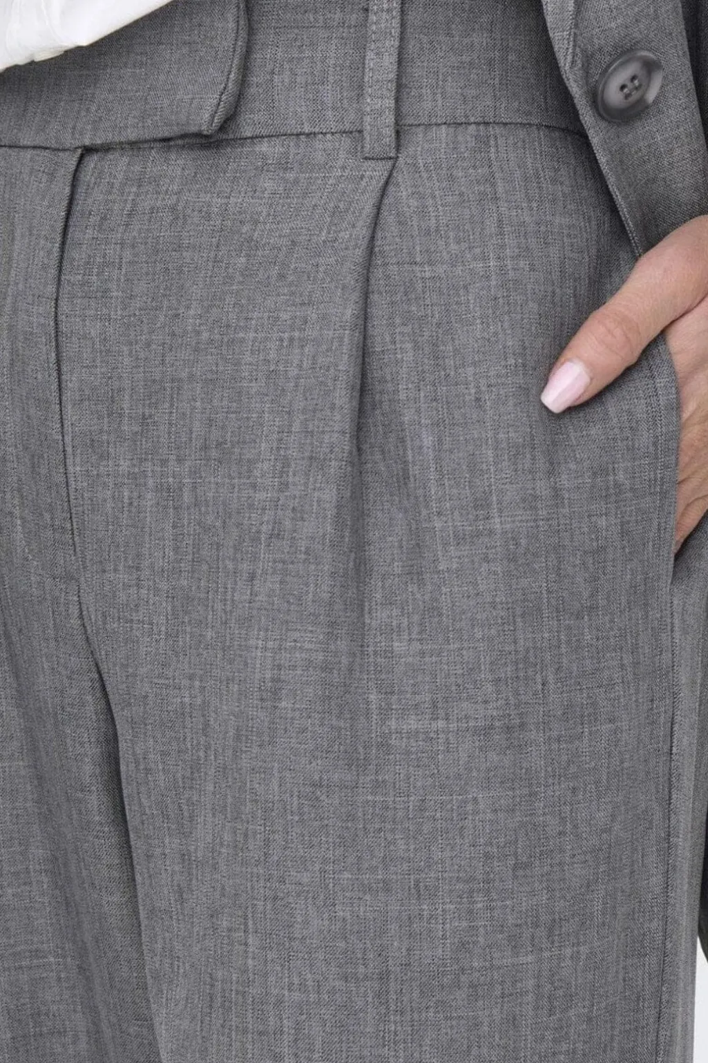 Grå bukser fra Only med lige ben og skræddersyet snit. Bukserne har en klassisk meleret overflade og er lavet i et let materiale med stretch.
