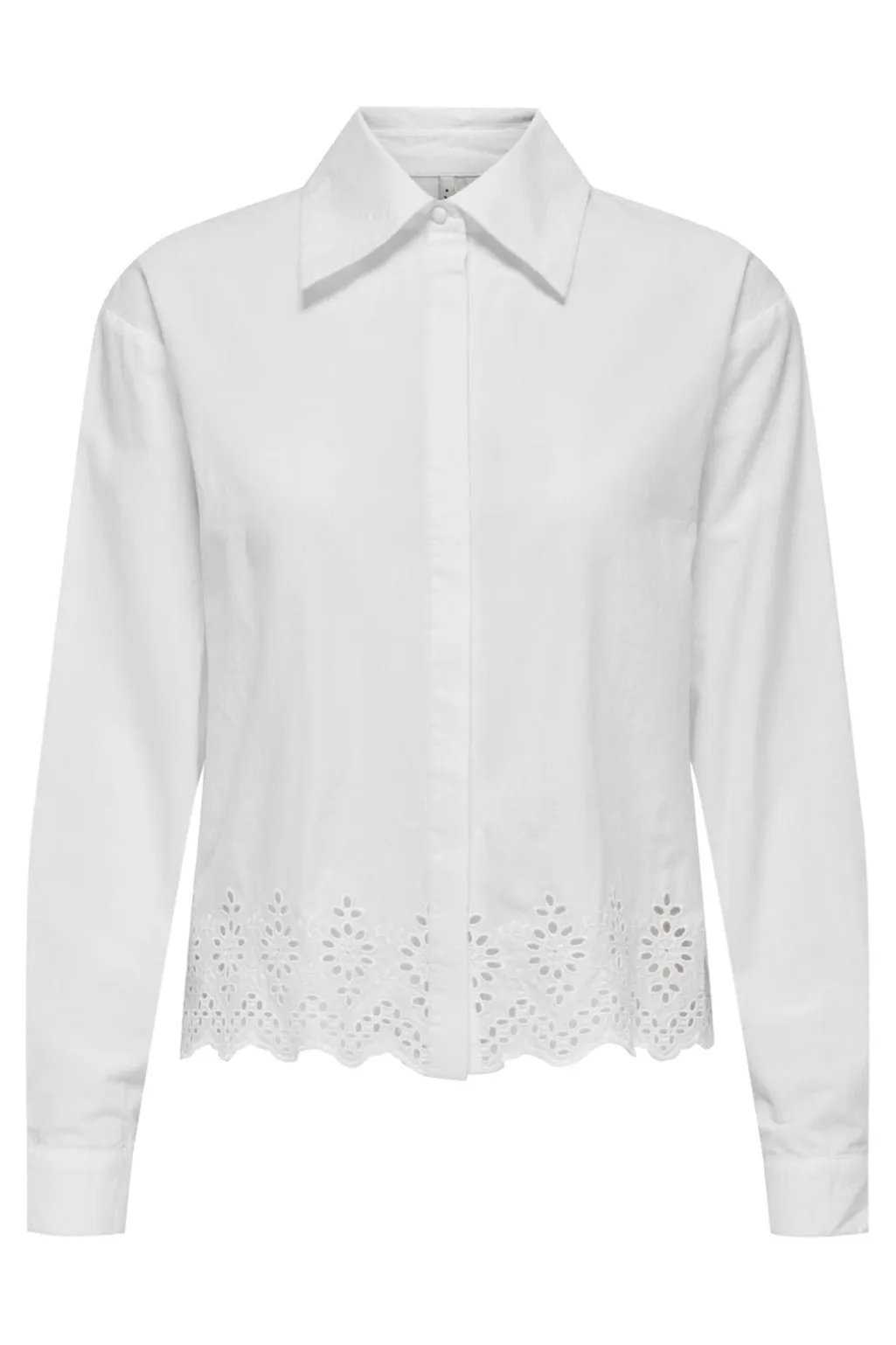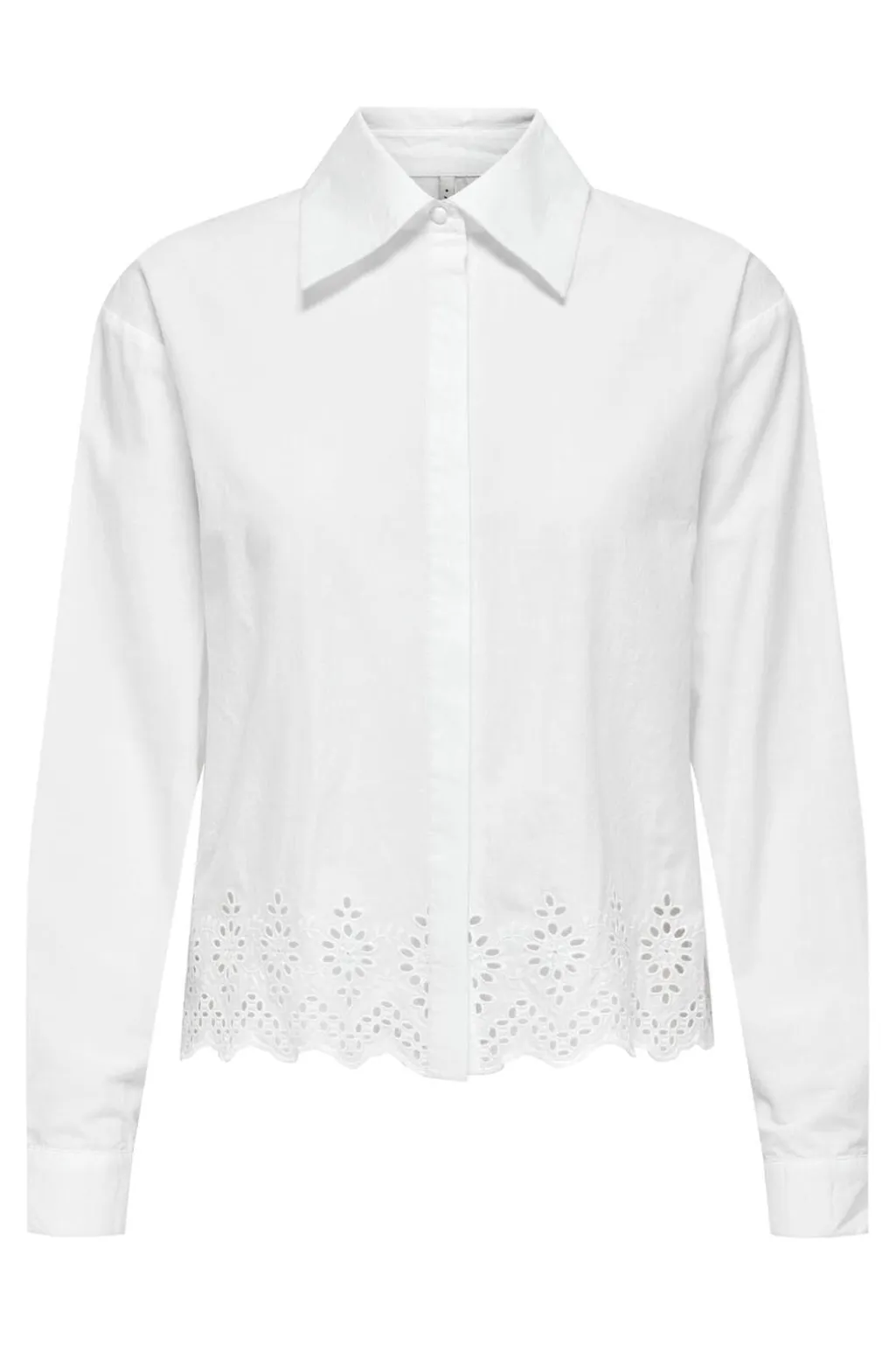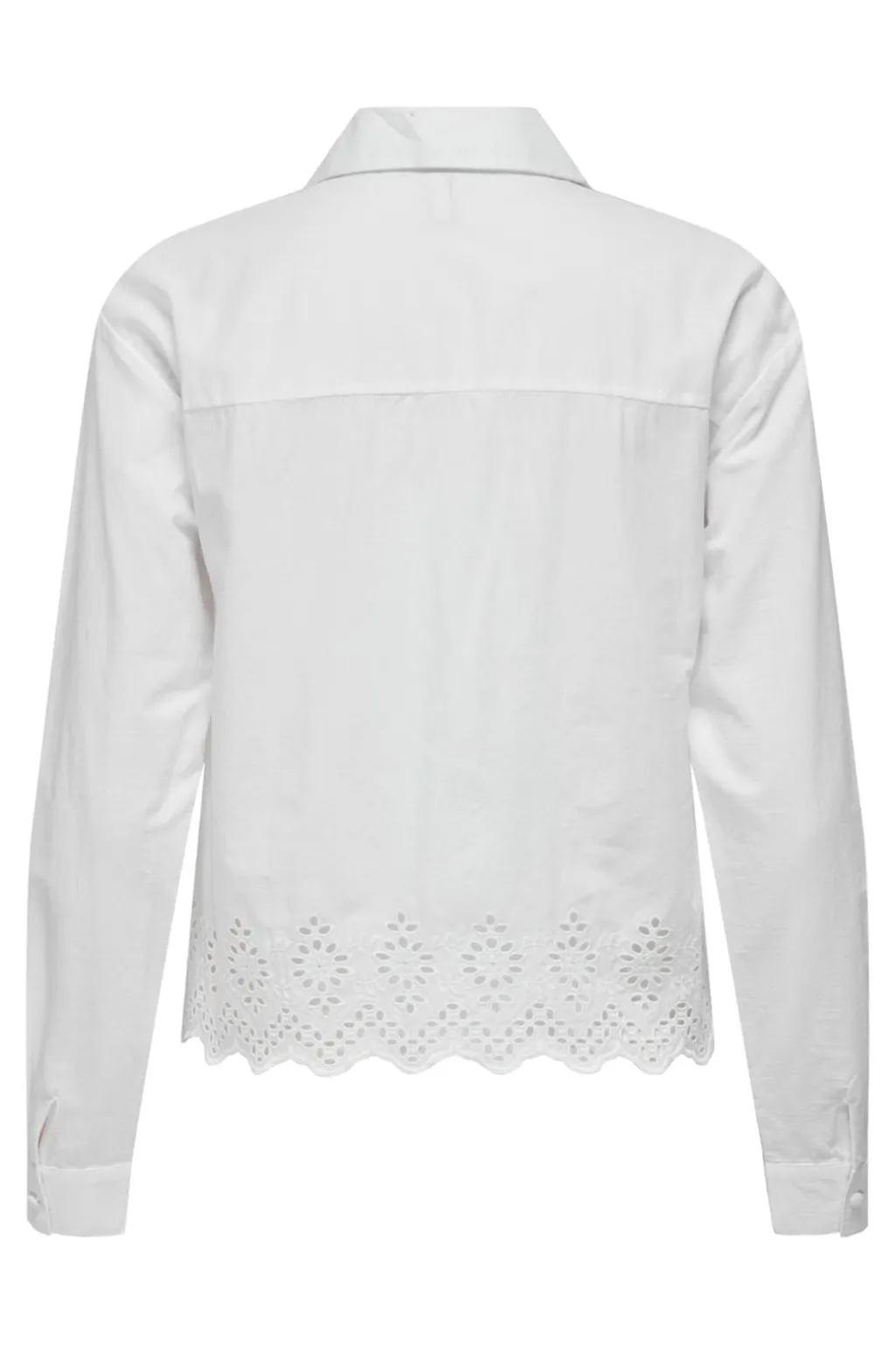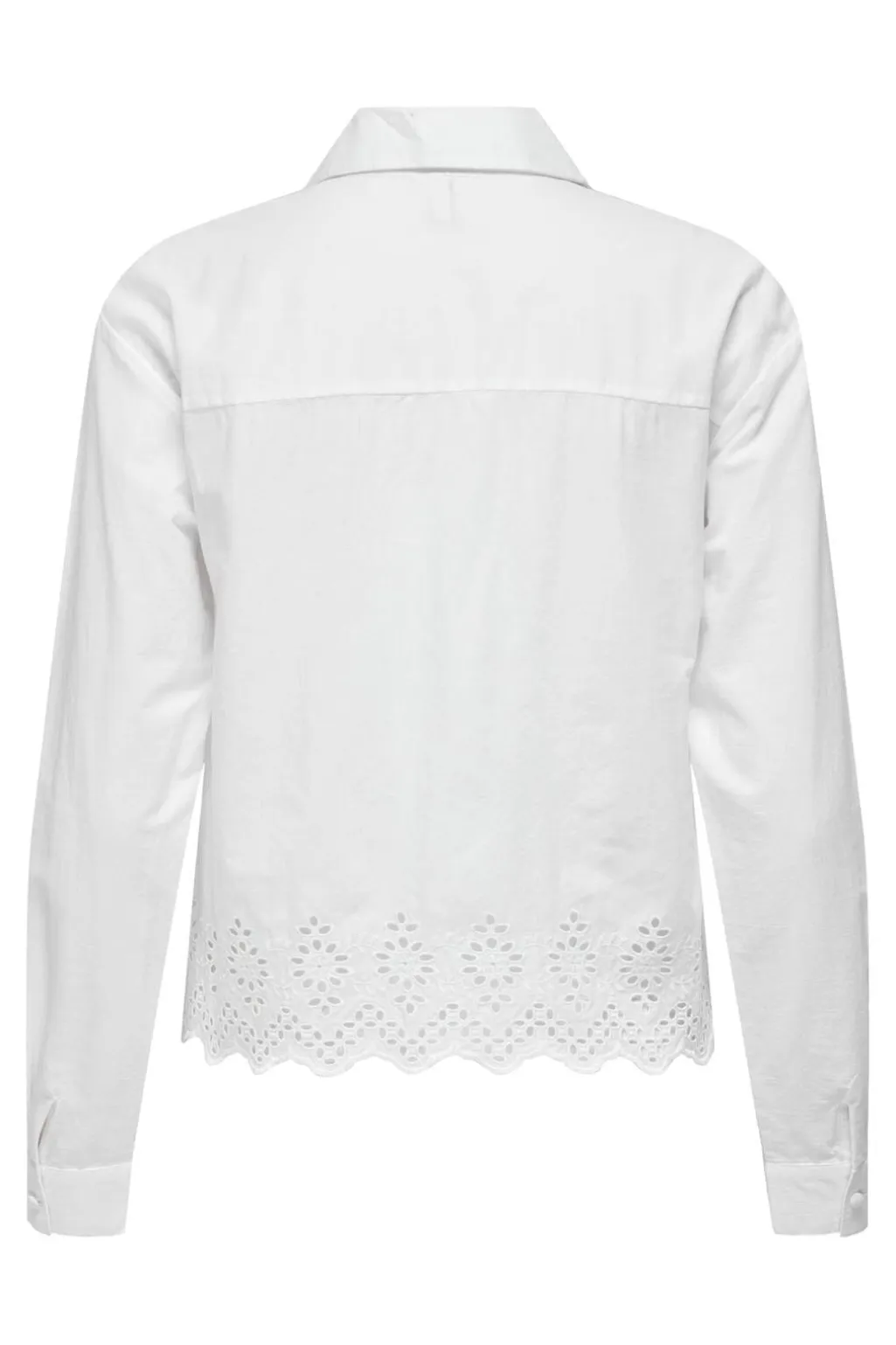 Hvid skjorte fra Only med broderie anglaise-detaljer langs kanten. Skjorten har lange ærmer og en klassisk skjortekrave med knaplukning foran.