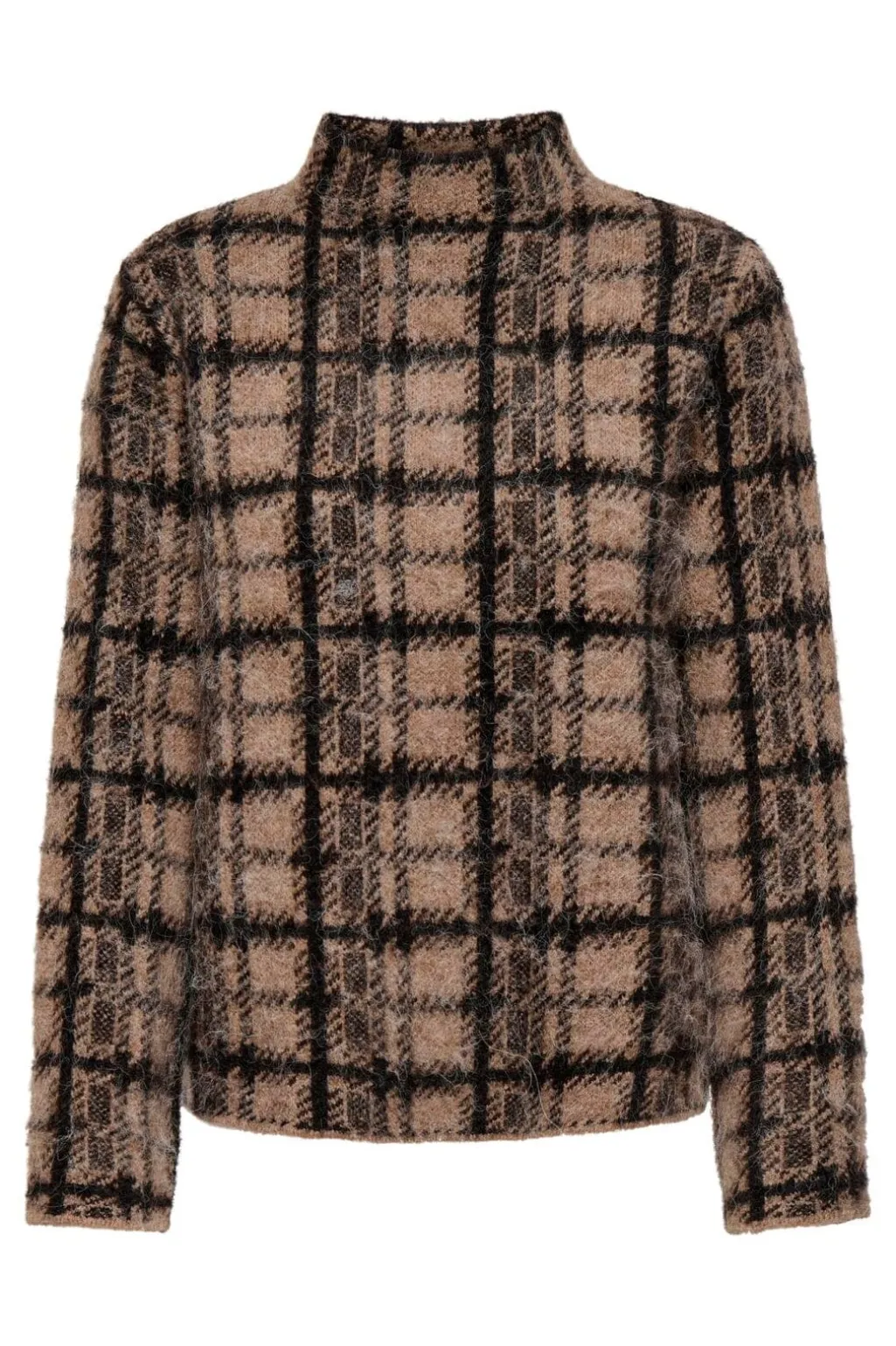 Striktrøje fra Only med et ternet mønster i brune og sorte nuancer. Trøjen har en høj hals og lange ærmer.