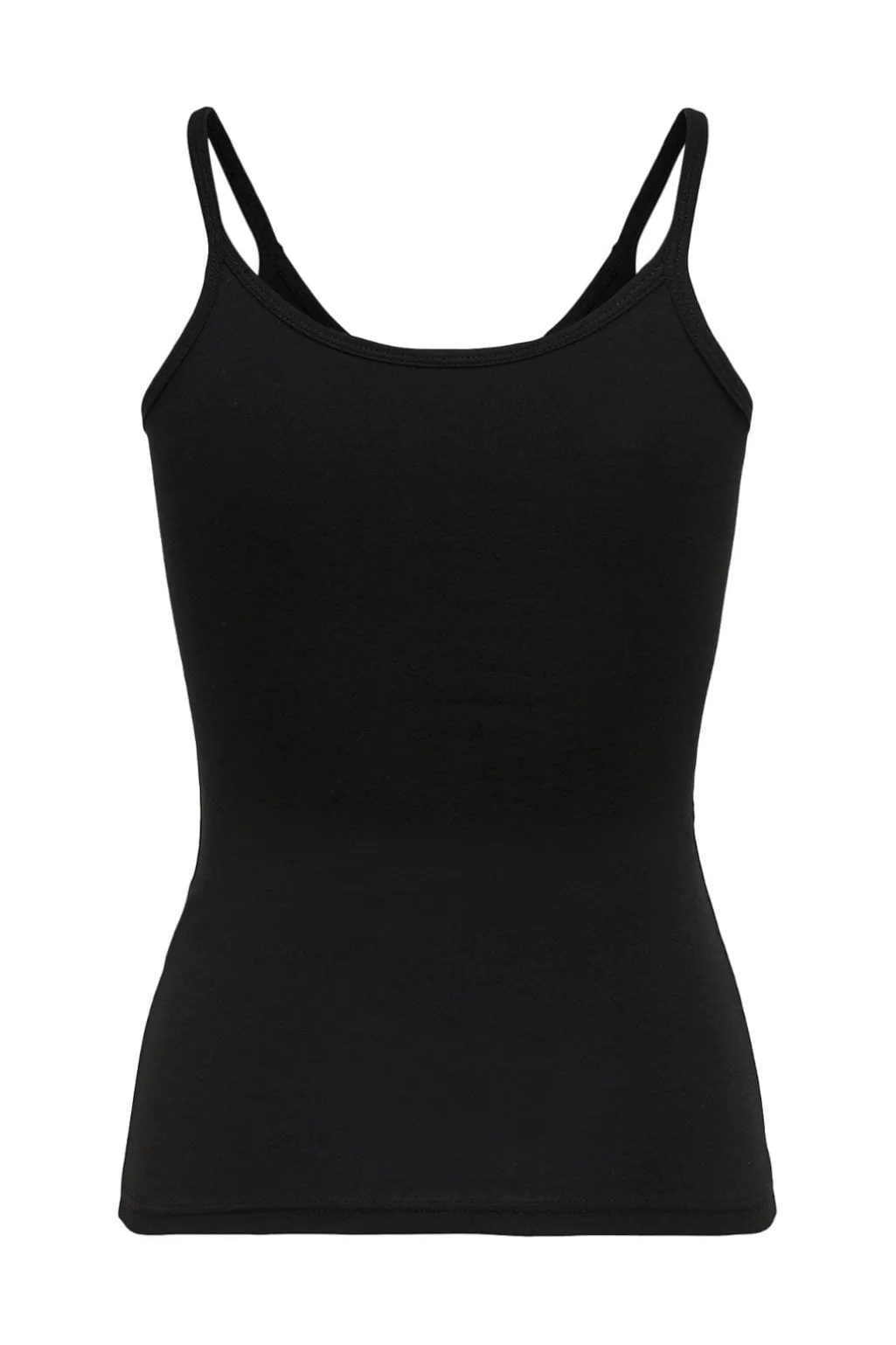 Sort strop-singlet fra Only med tætsiddende pasform. Toppen har tynde spaghetti-stropper og en rund halsudskæring, der giver et enkelt udtryk.