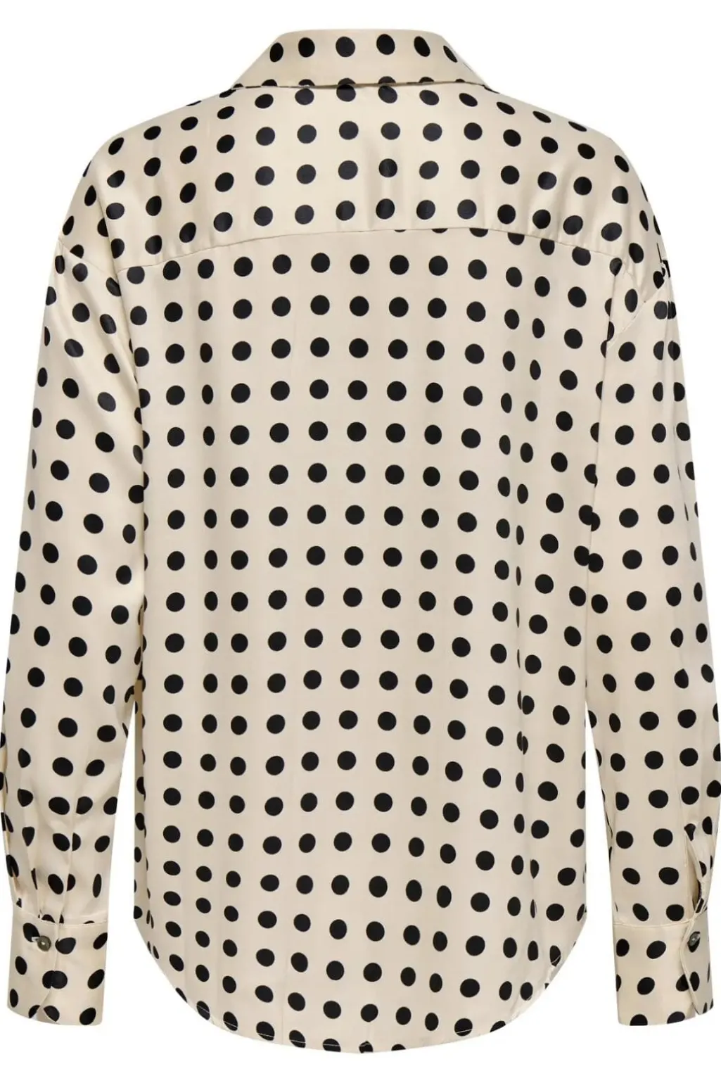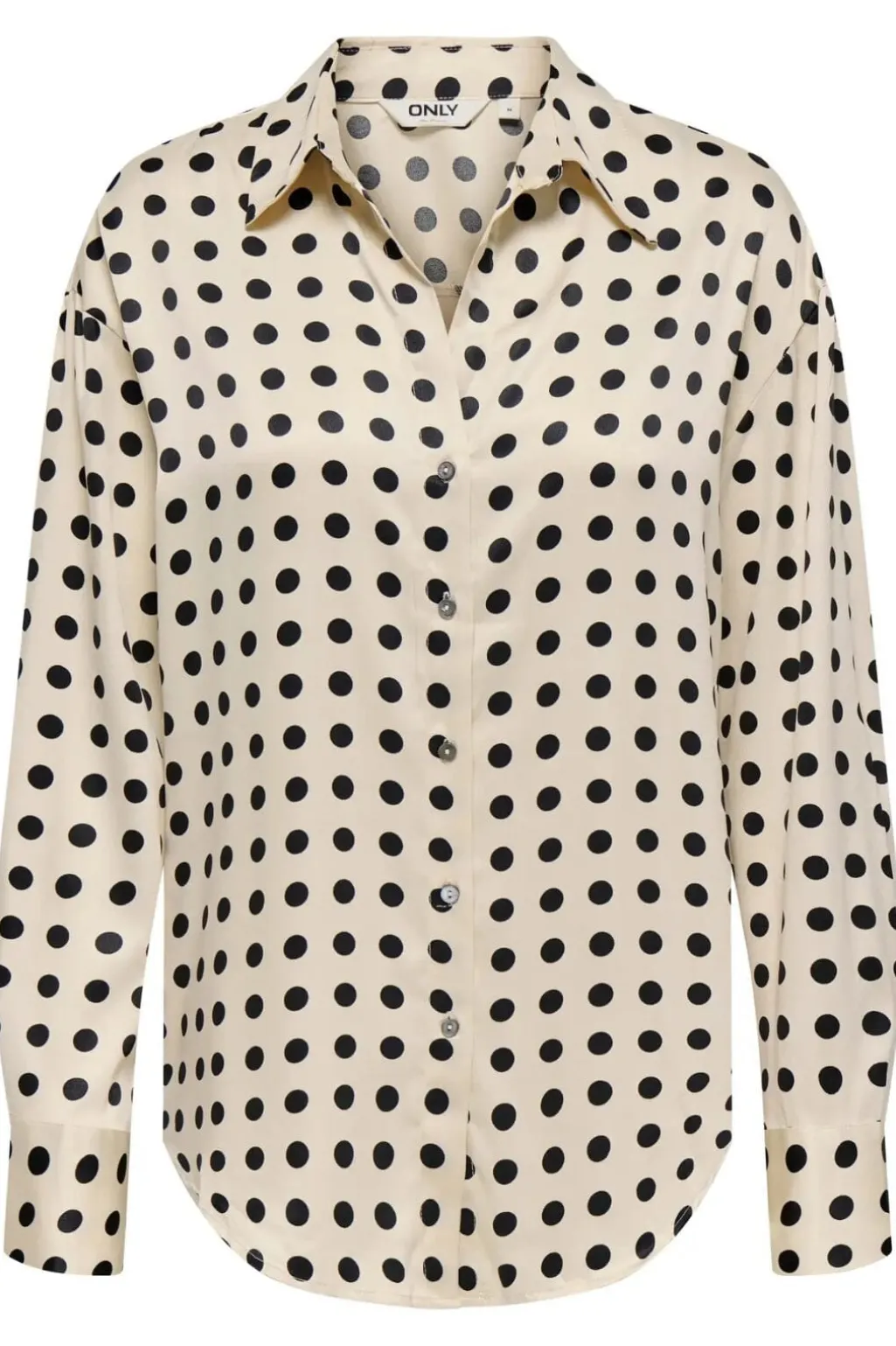 Satinfinish skjorte fra Only i frostet mandel med sorte prikker. Den løse pasform og skjortekraven giver et klassisk udtryk, mens satinmaterialet tilføjer et blødt fald.