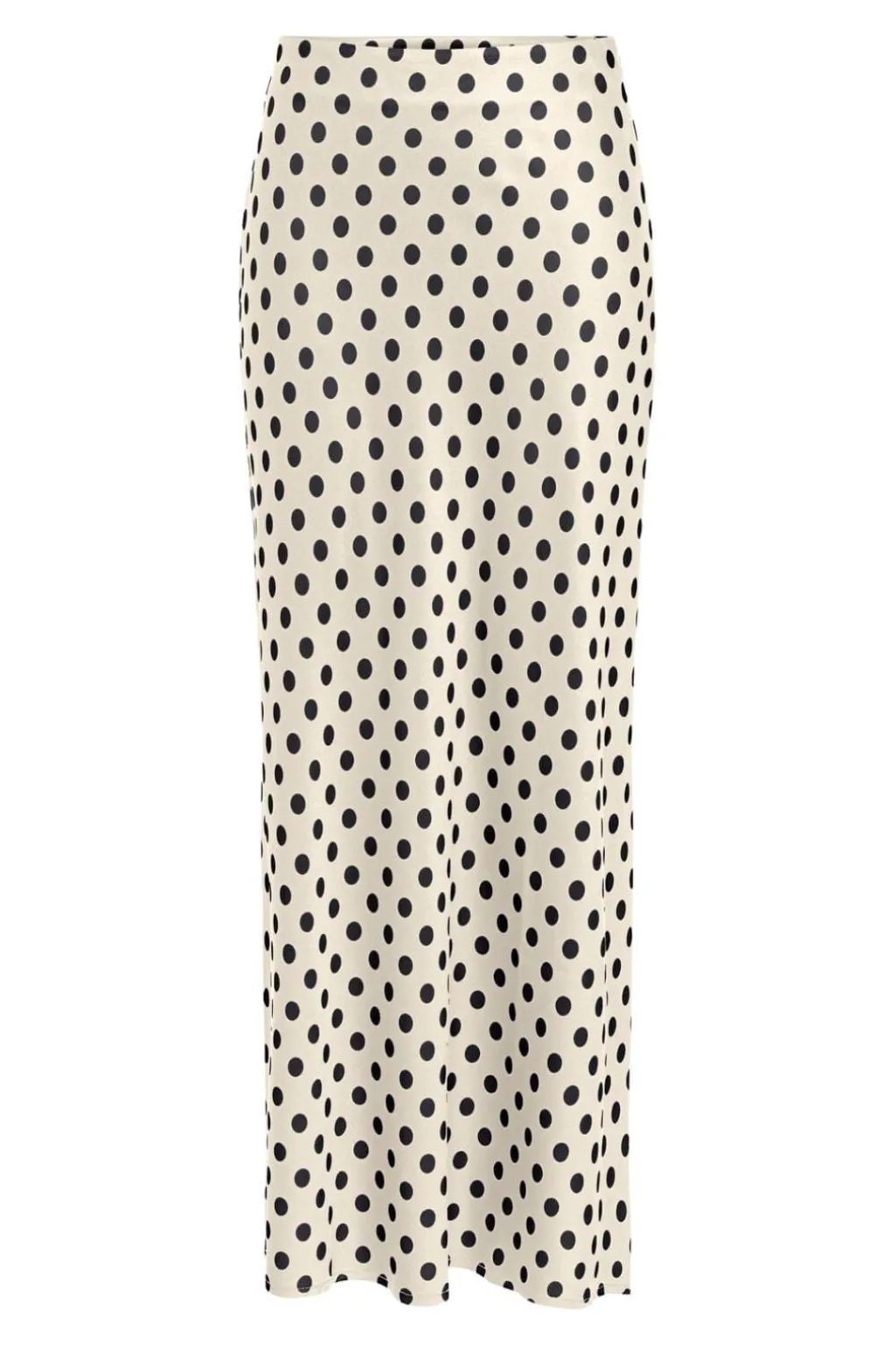 Lang satinnederdel fra Only i en lys beige nuance med sorte prikker. Nederdelen har et klassisk polka dot-mønster og en blød, glat overflade.
