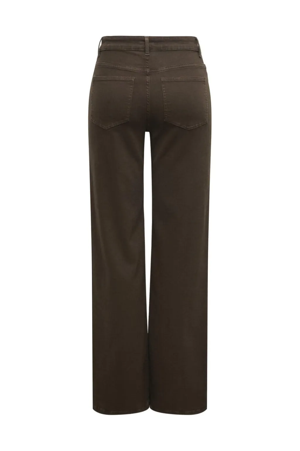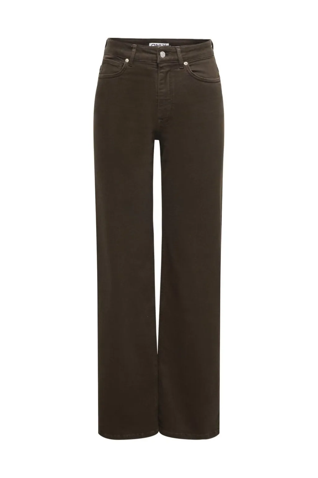 Mørkebrune denimbukser fra Only med høj talje og brede ben. Bukserne har knap- og lynlåslukning samt bæltestropper. Der er både for- og baglommer samt en møntlomme.