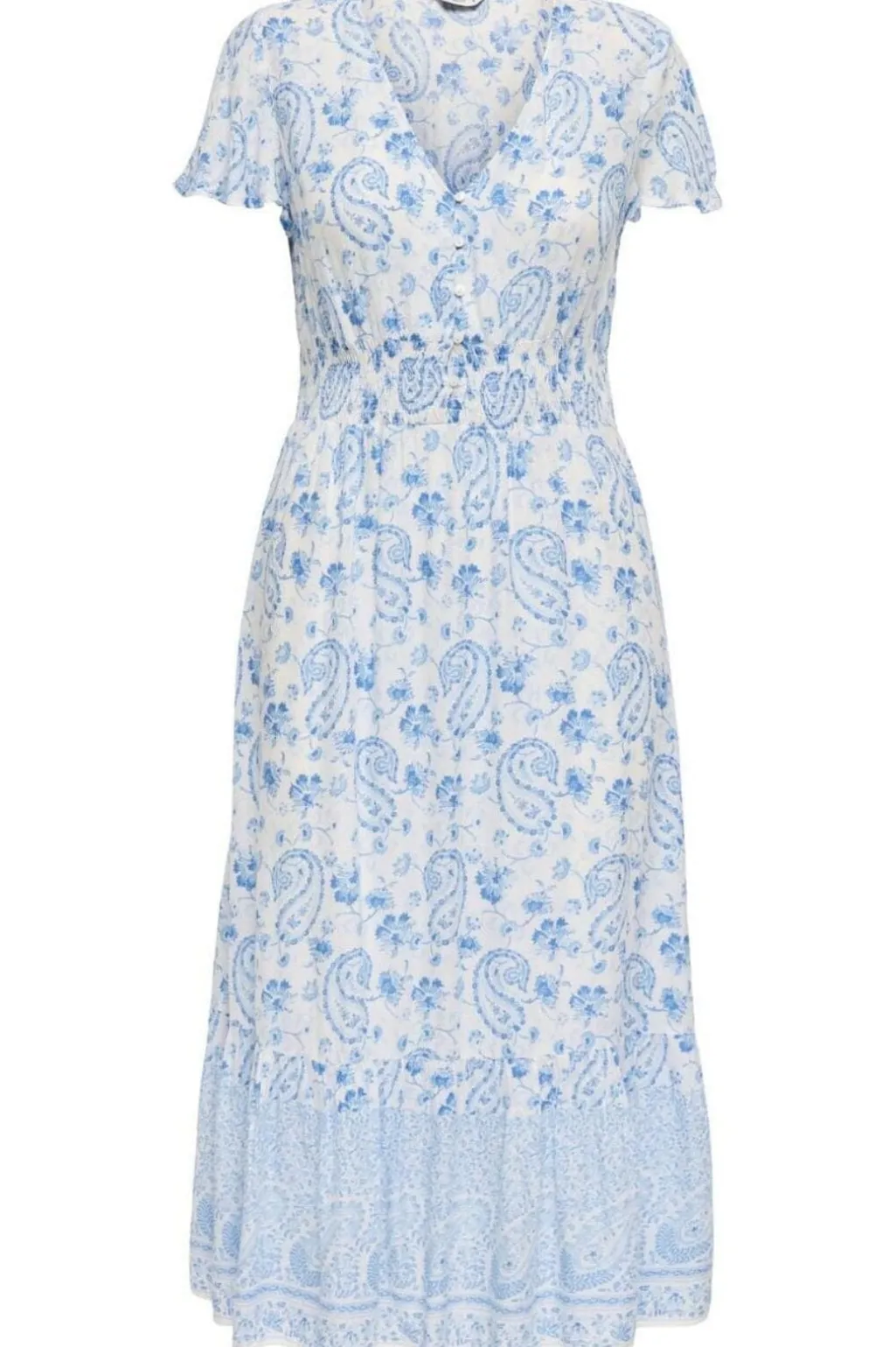 Midi-kjole fra Only med blå og hvidt paisley-mønster. Kjolen har V-hals med knapper og korte ærmer. Den smockede talje og flæsekanten giver kjolen et let og sommerligt præg.