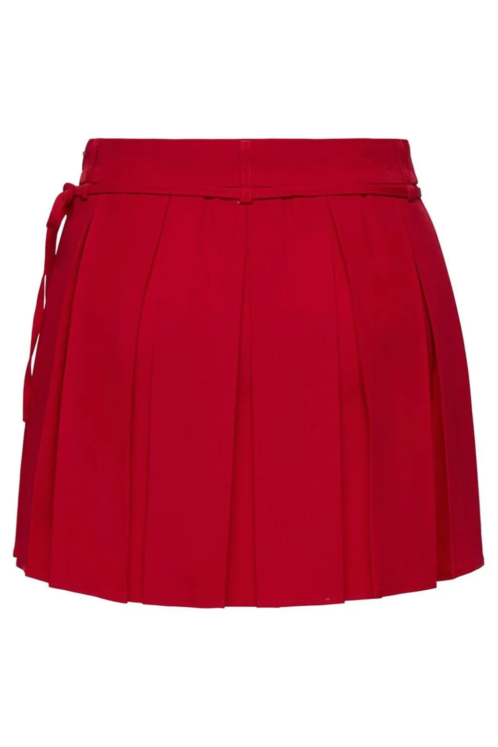 Rød plisseret nederdel fra Only med mellemhøj talje og ekstra kort længde. Nederdelen har slå-om-lukning med snøredetaljer og bæltestropper.
