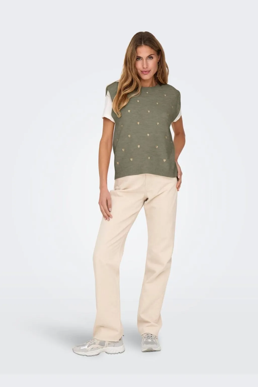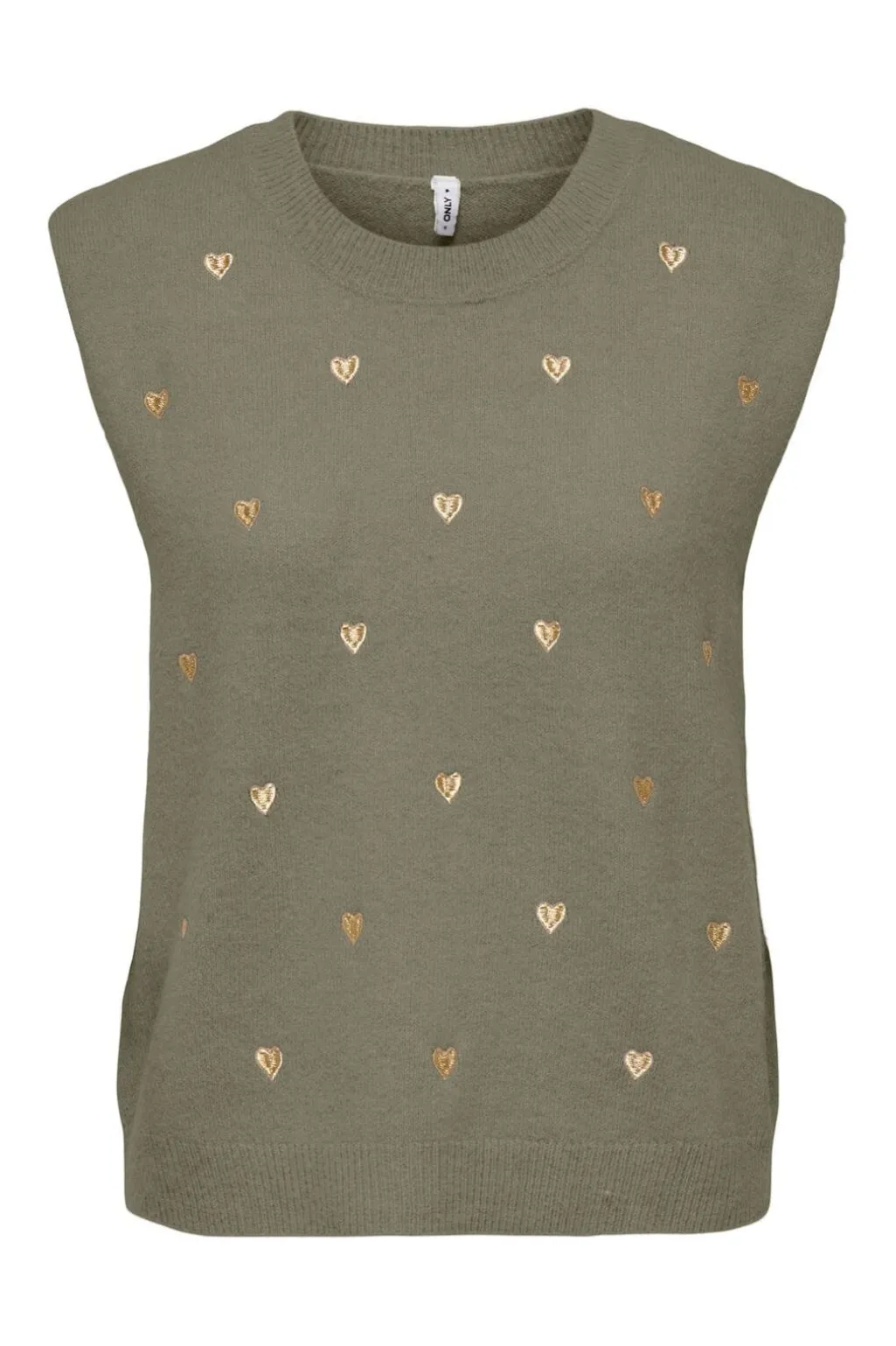 Ærmeløs vest fra Only i khakigrøn farve med broderede gyldne hjerter spredt over stoffet. Vesten har en rund halsudskæring og ribmanchetter.
