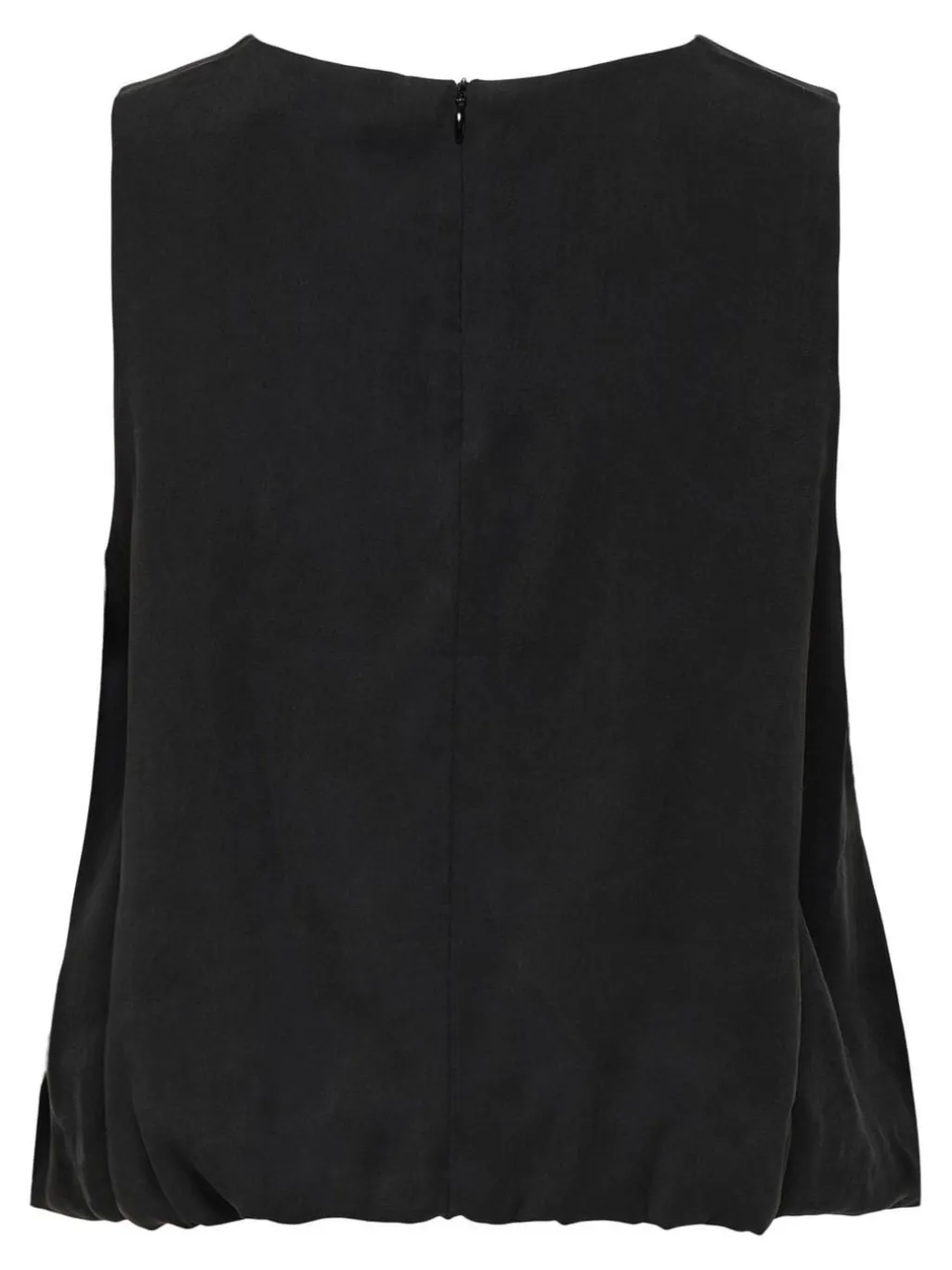 Sort ærmeløs top fra Only med rund halsudskæring. Toppen har en elastisk kant, der skaber en let bubble-effekt, og den lukkes med lynlås i ryggen.