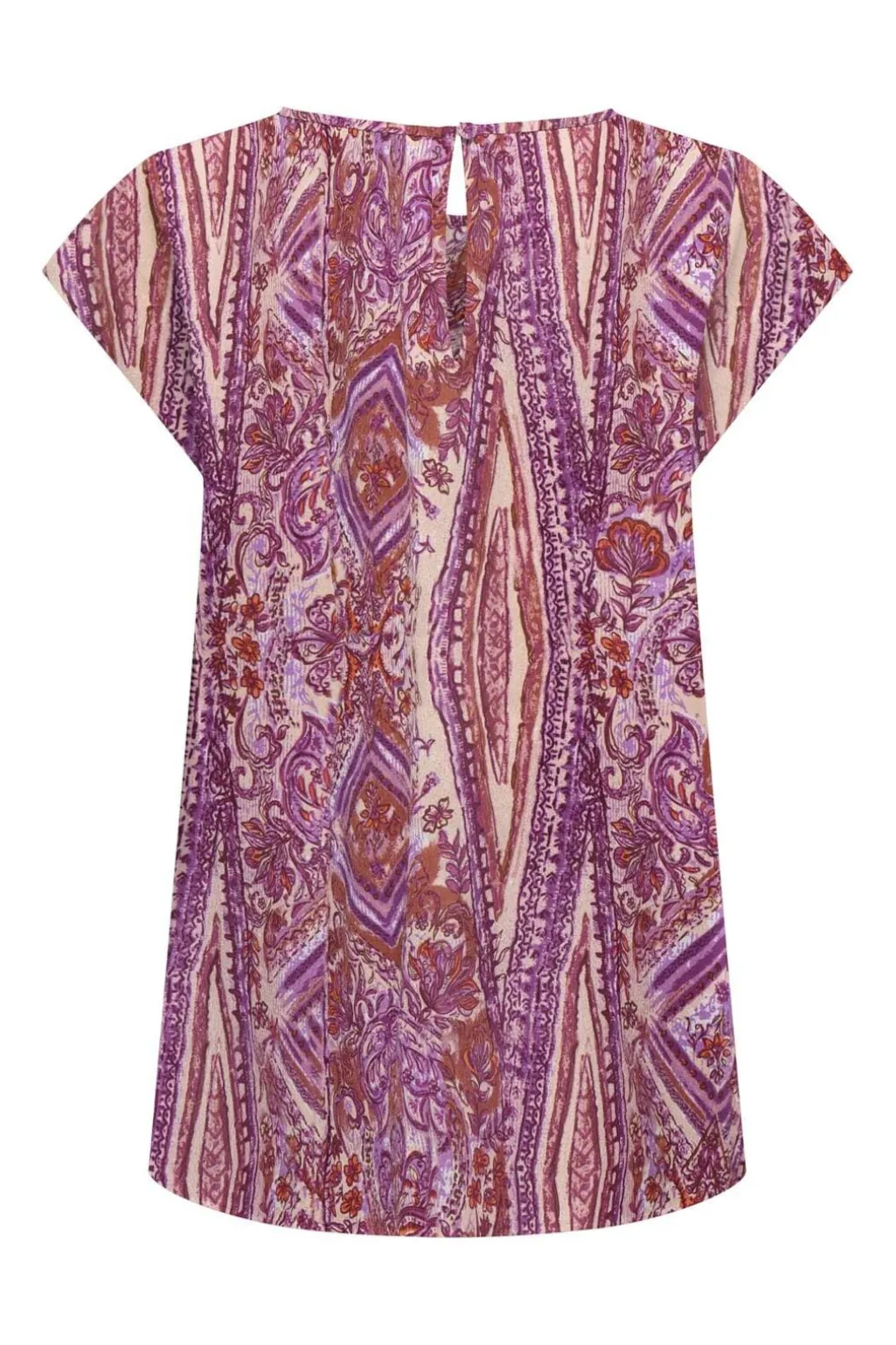 Mønstret top fra Only med et paisley-inspireret design i lilla, beige og cremehvide nuancer. Toppen har en rund halsudskæring og korte ærmer med knapdetaljer.
