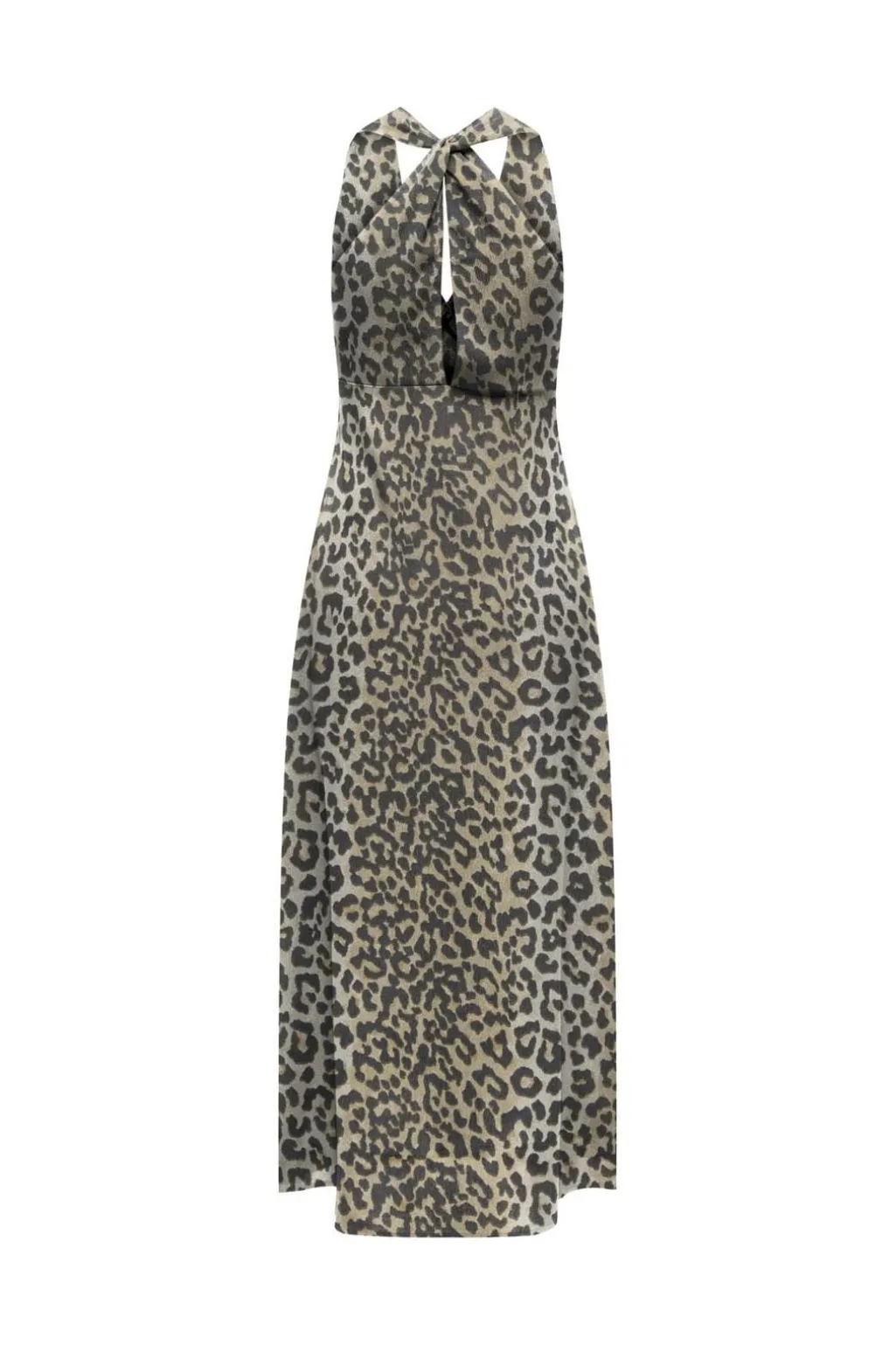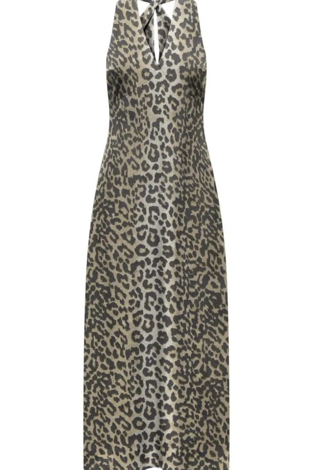 Lang kjole fra Only med leopardprint i beige og sort. Kjolen har halterneck-design med sløjfe og en V-udskæring. Den lange længde og lette struktur giver kjolen et rent udtryk.