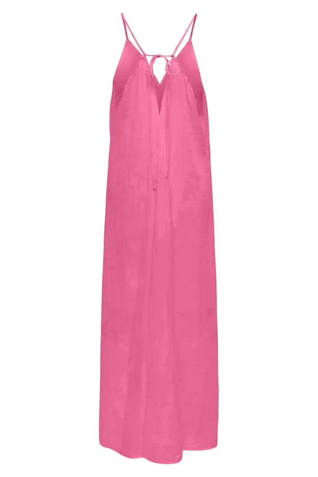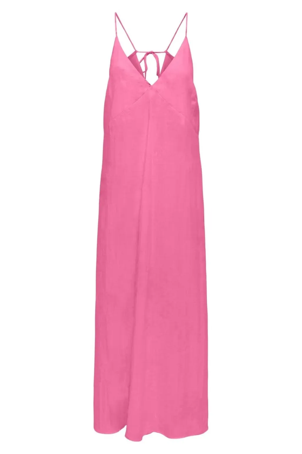 Pink maxi kjole fra Only med ankellang silhuet. Kjolen har V-halsudskæring, smalle stropper med snøring i ryggen og en løs pasform.