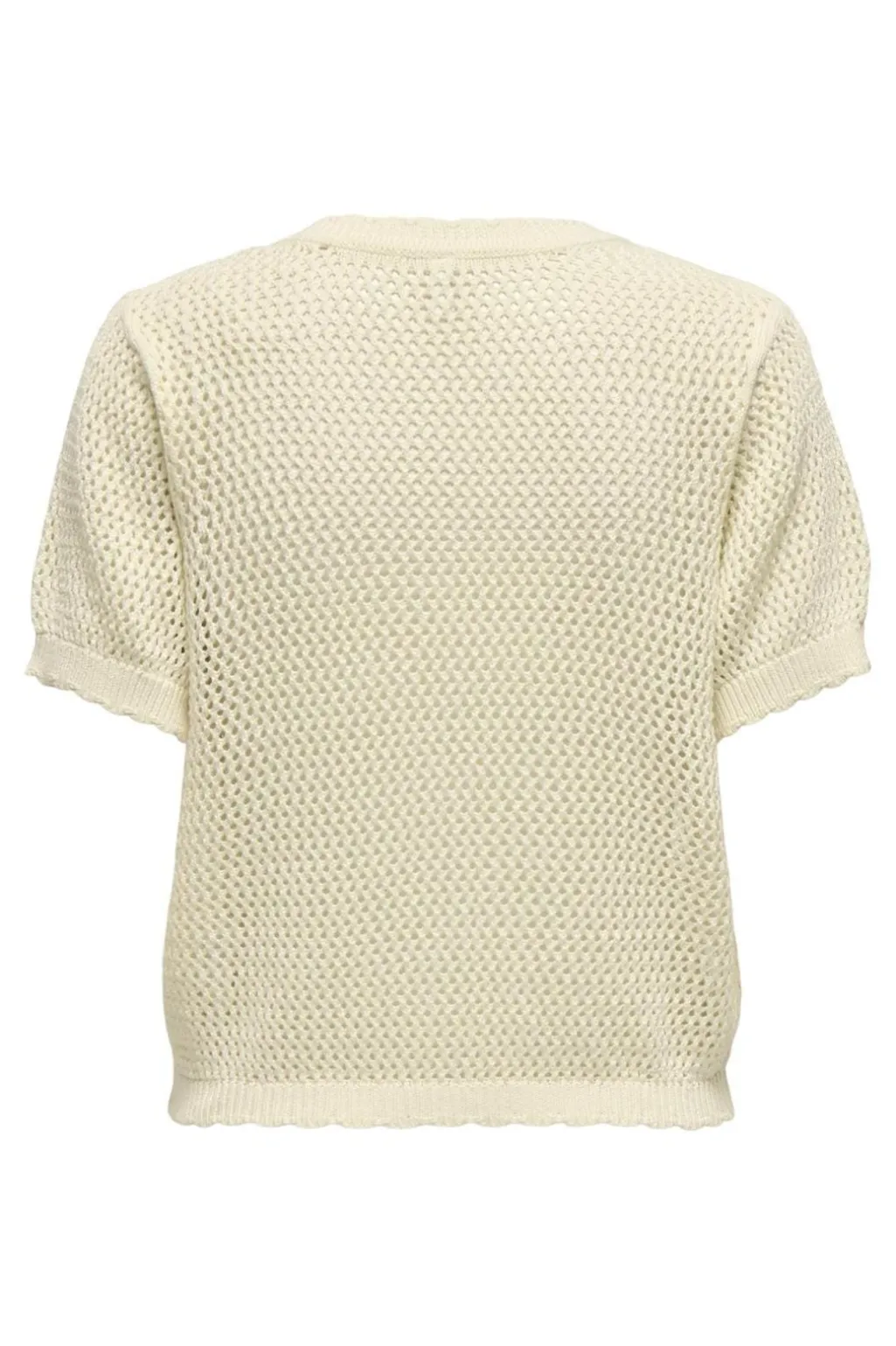 Kortærmet cardigan i lyse birkefarvede nuancer med strikket tekstur. Cardiganen har metalliske knapper foran og en rund halsudskæring med ribkanter ved ærmerne og bunden.