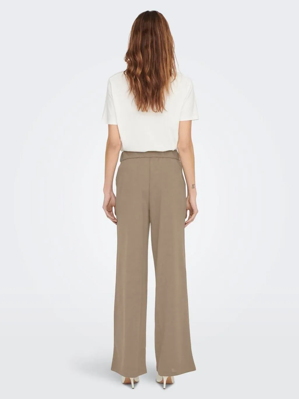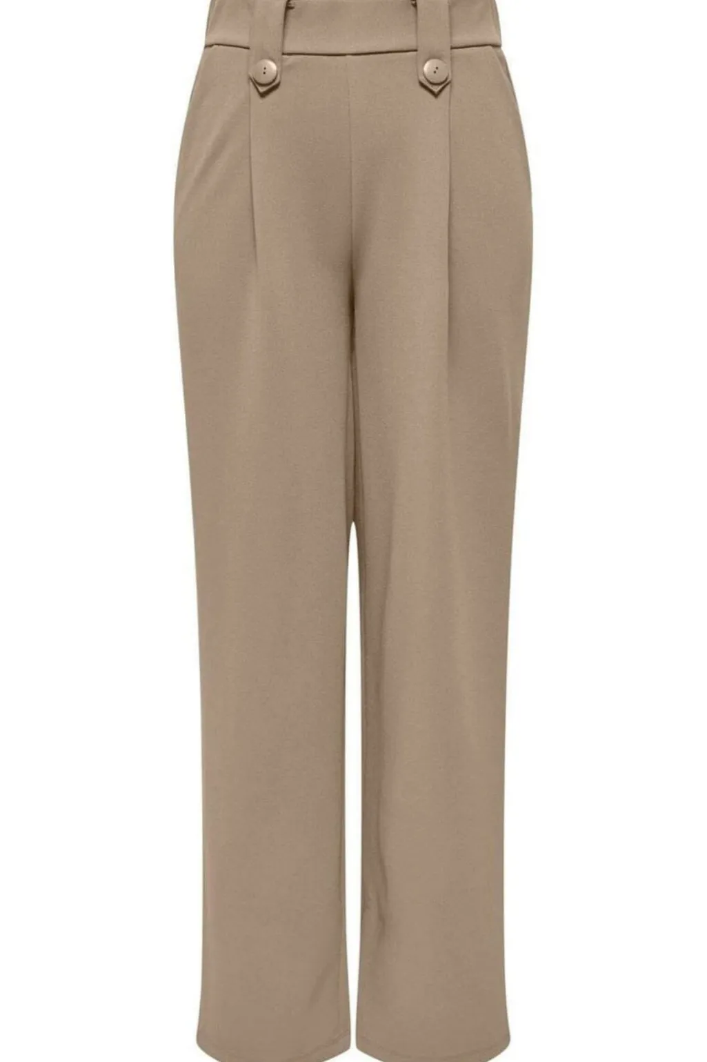 Lange bukser i humusfarvet stof med brede ben og plisseringer foran. Designet med knaplukning og bæltestropper ved taljen for nem justering af pasformen.