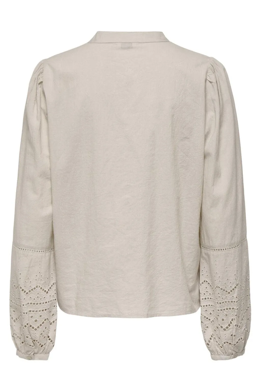 Lys skjorte i bomuldsmateriale med båndkrave og knaplukning. Skjorten har lange ærmer med broderede detaljer på ærmerne og ved skuldrene.