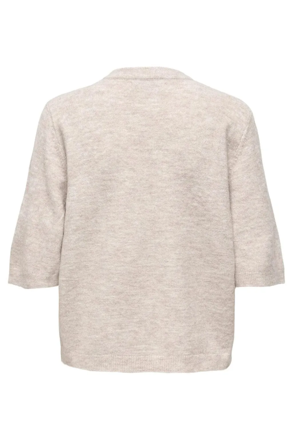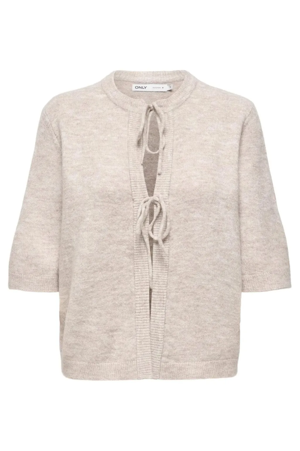 Beige cardigan fra Only med løs pasform. Cardiganen har rund hals, 3/4-ærmer og bindebånd foran med sløjfedetaljer.