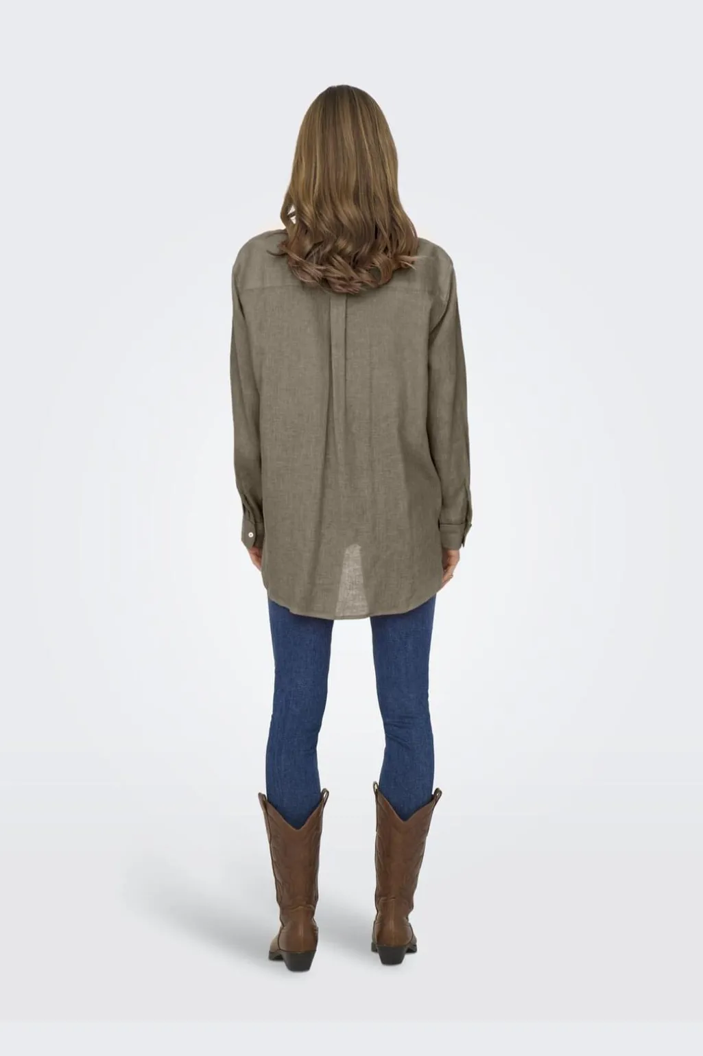 Skjorte fra Only i en dæmpet brun/oliven nuance. Den har klassisk skjortekrave, brystlomme og lange ærmer med knapmanchetter. Den let buede kant bagpå giver et afslappet look.