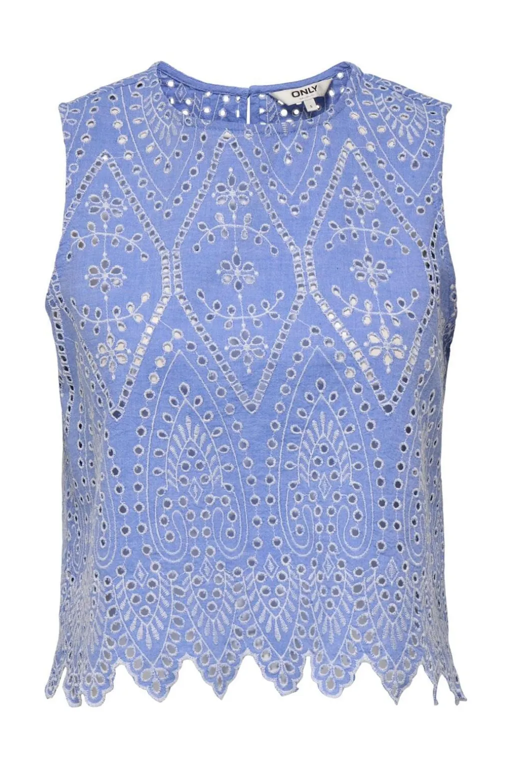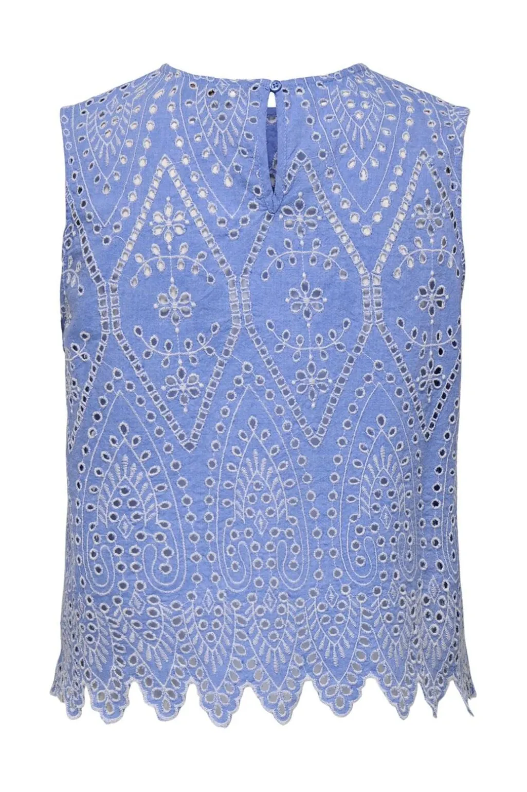 Lyseblå top fra Only med hvidt broderi i geometrisk mønster og blomsterdesign. Toppen har rund hals, ærmeløst design og knaplukning i nakken.