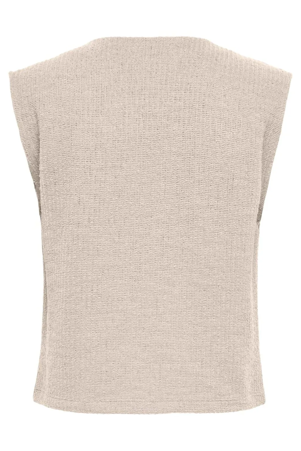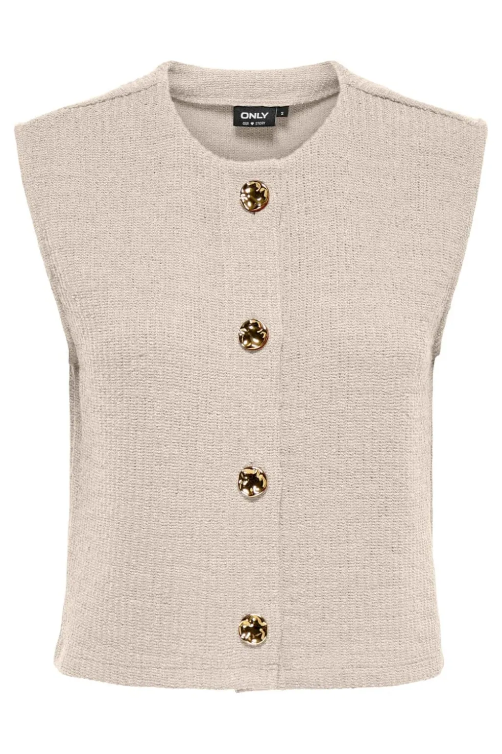 Ærmeløs vest fra Only i lys beige med fire guldknapper på forsiden. Vesten har en rund halsudskæring og er lavet af en materialeblanding.