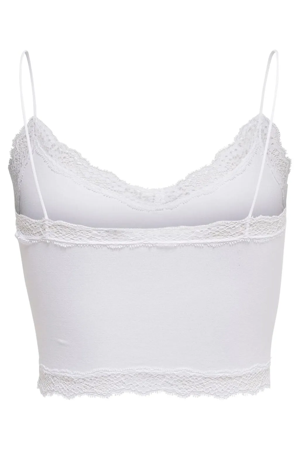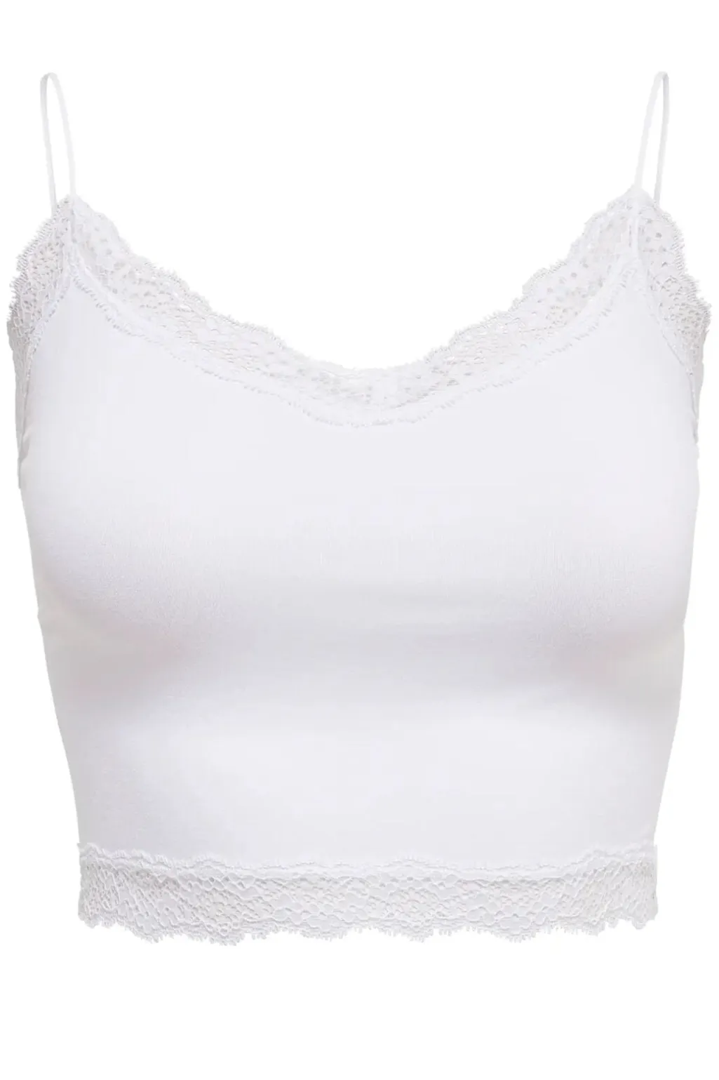 Hvid cropped top fra Only med blondedetaljer langs kanten. Toppen har en tætsiddende pasform med V-udskæring og tynde spaghettistropper.