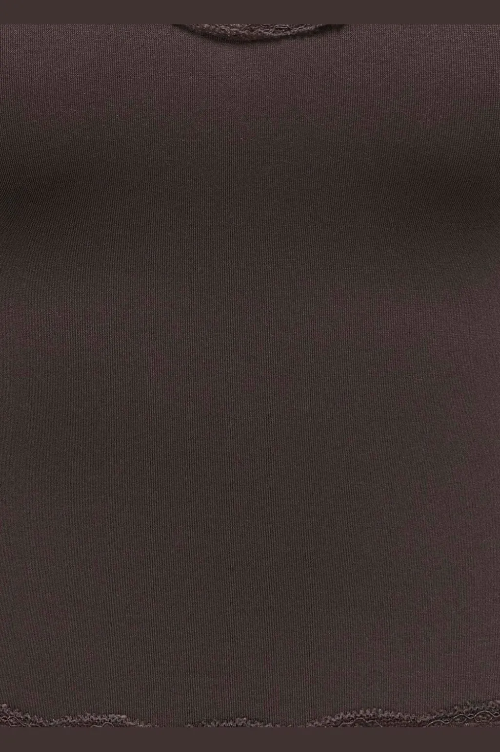 Brun cropped top fra Only med blondekanter. Toppen har en V-udskæring og er lavet i et blødt, strækbart materiale med fine blondedetaljer langs kanterne.