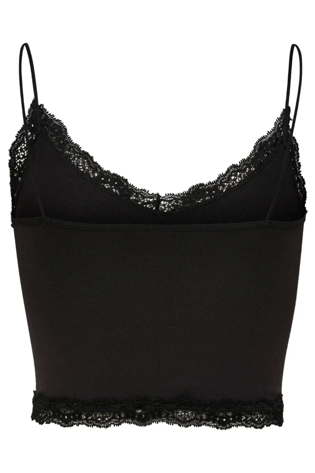 Sort cropped top fra Only med sømløst design. Toppen har blondedetaljer ved V-udskæringen og kanten samt smalle stropper, der kan justeres.