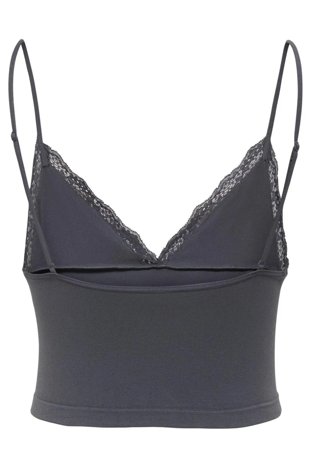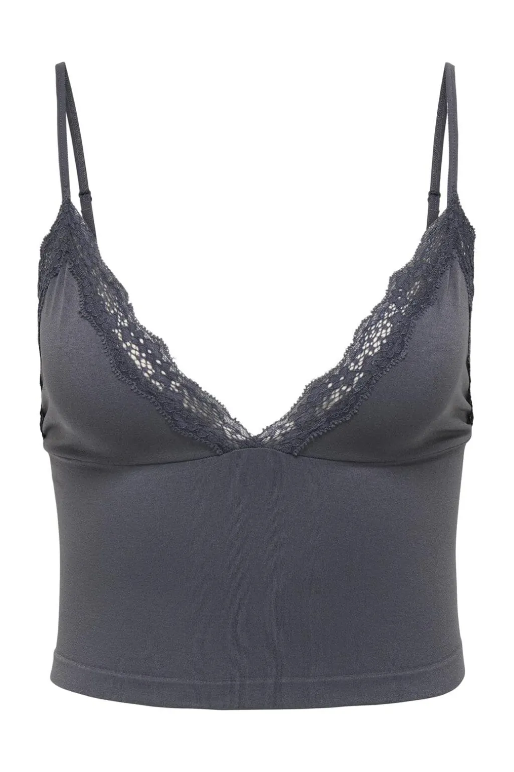 Grå singlet fra Only med blondedetaljer langs V-udskæringen. Toppen har en tætsiddende pasform og smalle stropper, der giver en glat silhuet under tøjet.