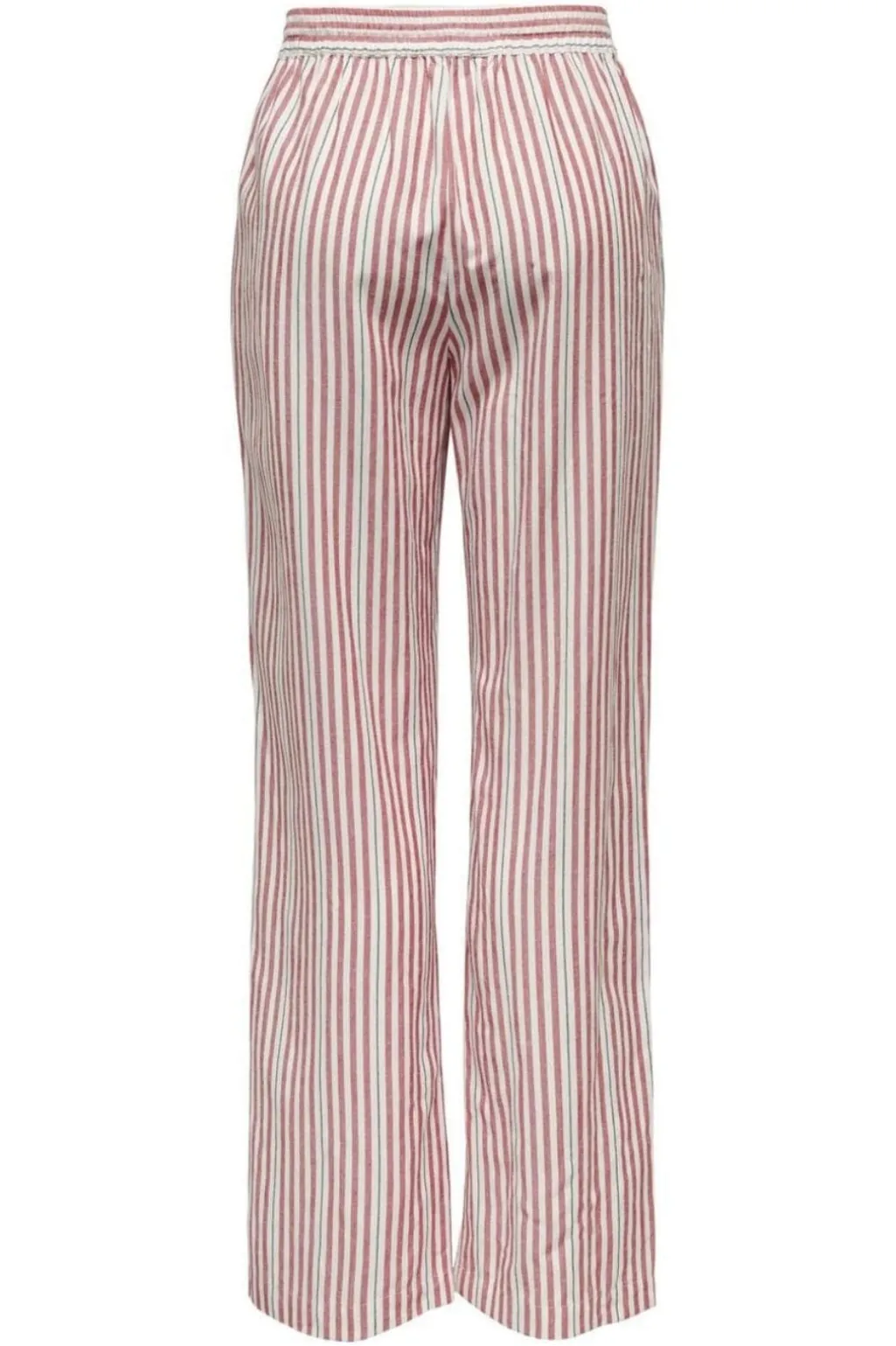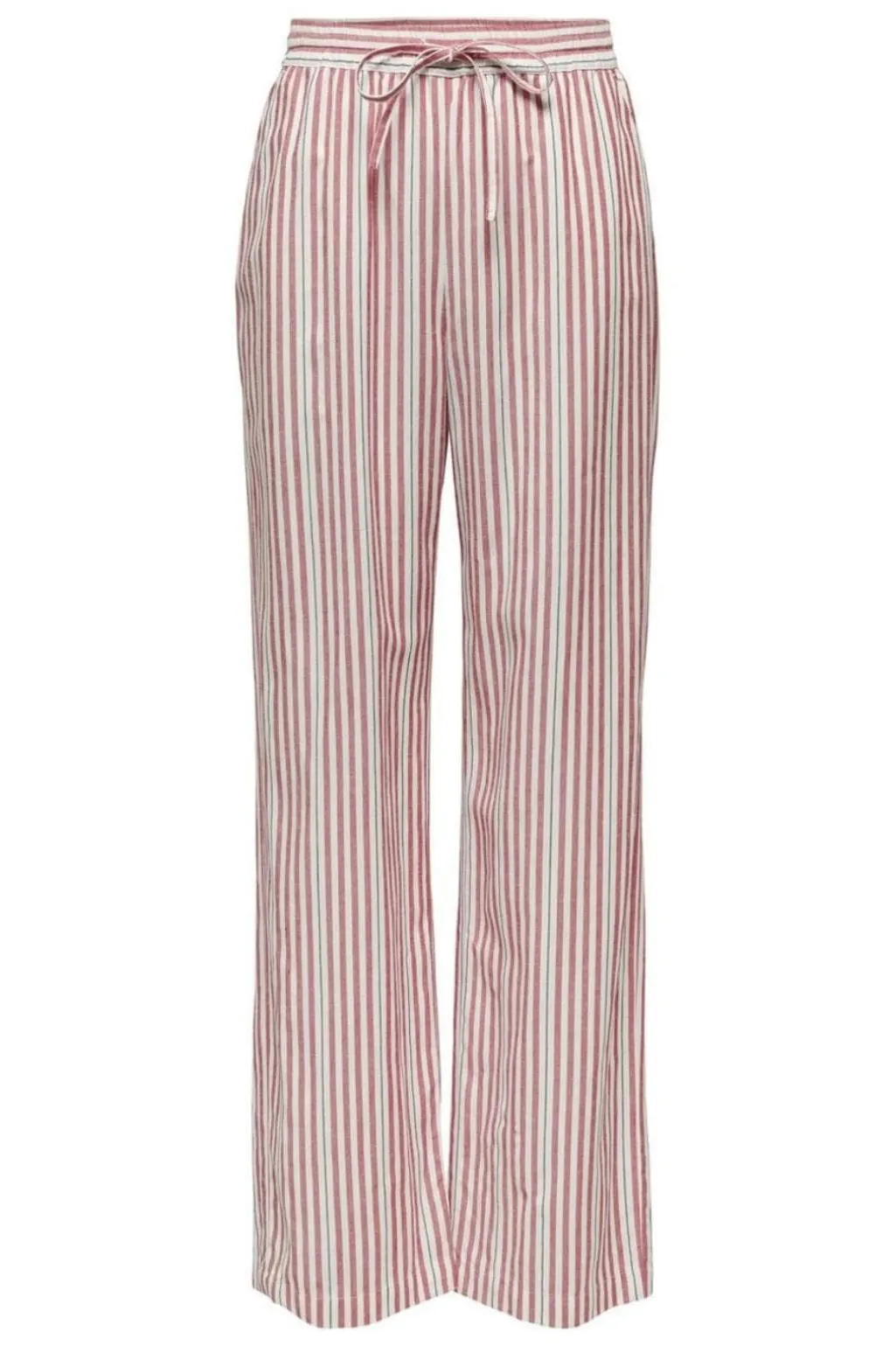 Stribede bukser fra Only med lodret mønster i rød og hvid. Bukserne har en afslappet stil med elastik og bindebånd i taljen.